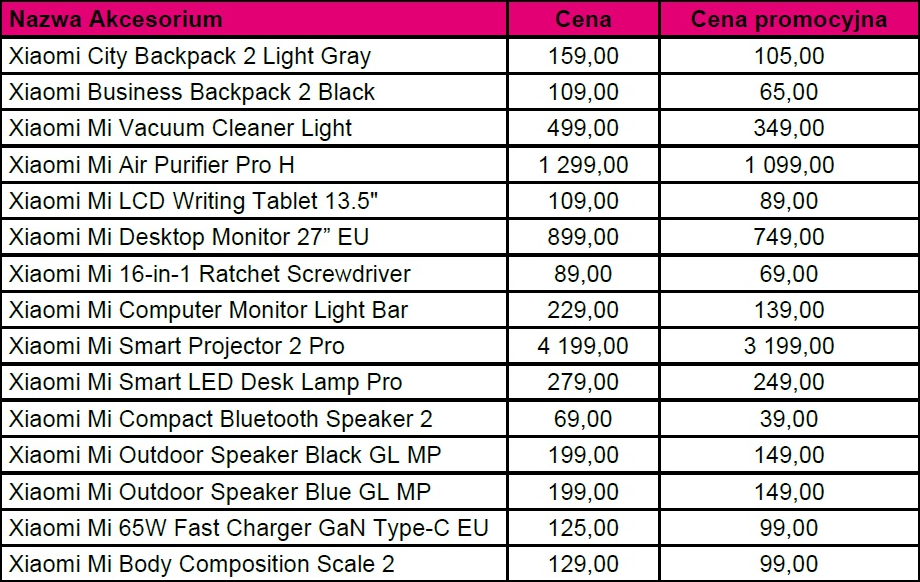 W ofercie promocyjnej znaleźć można prawdziwe technologiczne rarytasy, takie jak projektor multimedialny Xiaomi Mi Smart Projector 2 Pro, który chętni kupią ze zniżką aż o 1000 zł taniej. Wyjątkowo praktycznym sprzętem dla wielu osób może okazać się 27-calowy monitor Xiaomi Mi Desktop 27, przeceniony dla naszych klientów z 899 zł do 749 zł, stanowiący świetne narzędzie pracy i rozrywki. Dokładną listę pozycji dostępnych w T-Mobile ze zniżką można znaleźć w tabelce poniżej.