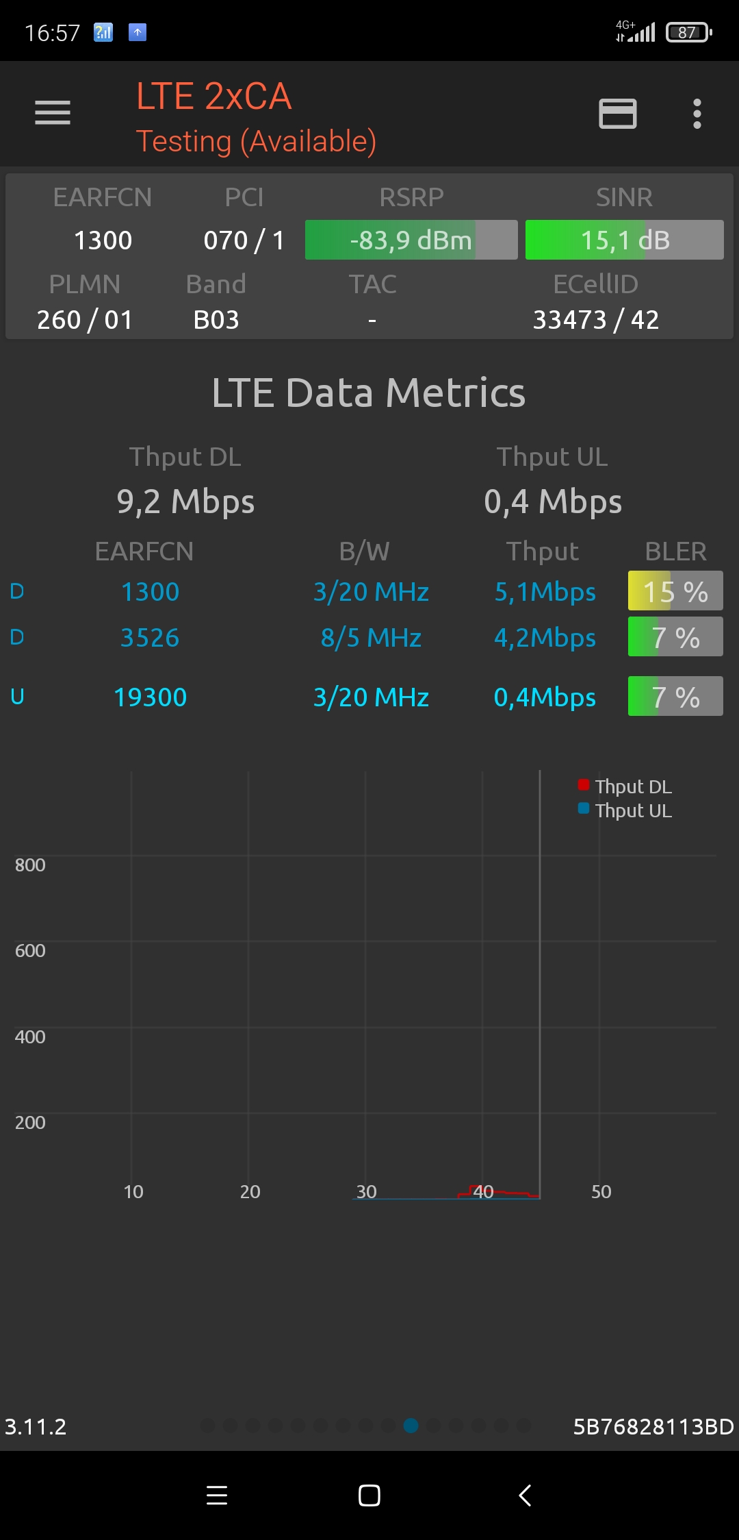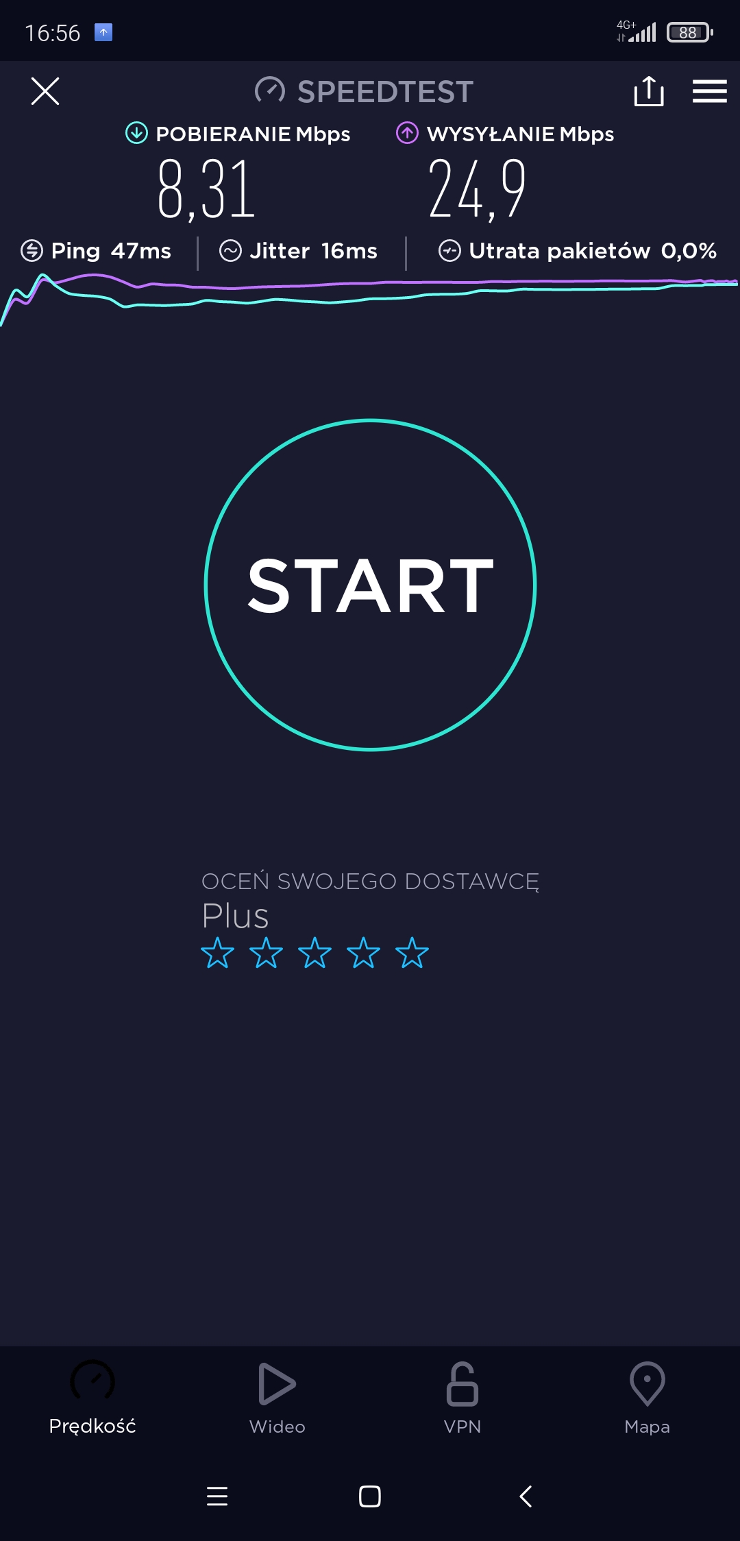 Wracamy do „dyżurnej” stacji Plusa w lokalizacji przy ul. Sobieskiego 53 – BT33473. Mimo rozszerzenia schematu GUL o kolejne 20MHz w LTE stacja nie reprezentuje wyników, które dziś można uznać za pożądane. Tym bardziej, że zorganizowano do niej dosył światłowodowy. Czyżby mimo wszystko deficyt dosyłu? A może brak właściwego oszacowania docelowego pola pokrycia i deficyt zasobów radiowych, ponieważ dotąd uznawano ją jako… „śpiącą”? Poniżej to, co zobaczyliśmy dziś w wynikach speedtest.net w segmencie LTE tuż przy jednym z biurowców KAS przy ul. Okopowej.