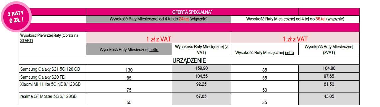 Proponowane w świątecznej ofercie biznesowej T‑Mobile smartfony reprezentują różne segmenty rynku urządzeń, dzięki czemu każdy klient może dopasować telefon do swoich potrzeb. I tak – osoby, które wybiorą model Samsung Galaxy S21 5G, zapłacą nie 24, a 21 rat w wysokości 130 zł lub 33 raty (zamiast 36) w kwocie 85 zł. Z kolei klienci biznesowi, którzy zdecydują się na smartfon Samsung Galaxy S20 FE zapłacą 21 rat w wysokości 85 zł lub 33 raty w wysokości 55 zł. Z kolei przedsiębiorcy, którzy postawią na Xiaomi 11 Lite 5G NE, w przypadku 21 rat zakupią telefon za 75 zł miesięcznie. Zaś w wersji 33-ratowej będzie to 50 zł na miesiąc. Specjalną ofertę przygotowaliśmy ponadto dla firm zainteresowanych realme GT Master Edition 5G. W tym wypadku 21 rat wynosić będzie 55 zł, natomiast 33 raty oznaczać będą koszt 35 zł miesięcznie. Przy zakupie każdego z wymienionych modeli przedsiębiorcy zapłacą także 1 zł z VAT na start.
