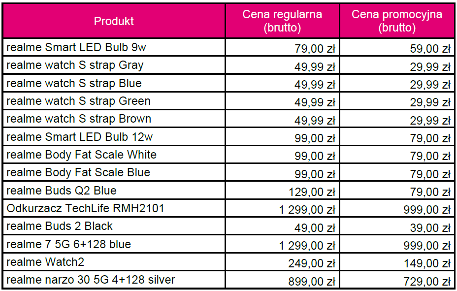 Odbierz do 40% rabatu na akcesoria realme w T-Mobile. Listy świątecznych prezentów na dobre zagościły w naszych notesach i notatkach. W poszukiwaniu idealnych podarunków przeszukujemy strony internetowe oraz centra handlowe. Dla naszych klientów indywidualnych, którzy szukają dobrych okazji, w ramach „Happy Fridays” przygotowaliśmy do 40% rabatu na wybrane produkty realme – takie jak smartwatche, słuchawki, odkurzacz, a także telefony. Prezent można odebrać od 19 do 23 listopada w aplikacji „Mój T-Mobile” lub poprzez SMS. Gadżety technologiczne to jedne z najpopularniejszych podarunków mikołajkowych i świątecznych. Innowacyjne rozwiązania zamknięte w zgrabnym opakowaniu, które ułatwiają nam codzienne funkcjonowanie – któż nie cieszyłby się z takiego prezentu? Dlatego też w tym tygodniu w ramach „Happy Fridays” przygotowaliśmy dla naszych klientów indywidulanych naprawdę dobrą okazję – rabat w wysokości do 40% na wybrane produkty i akcesoria realme.