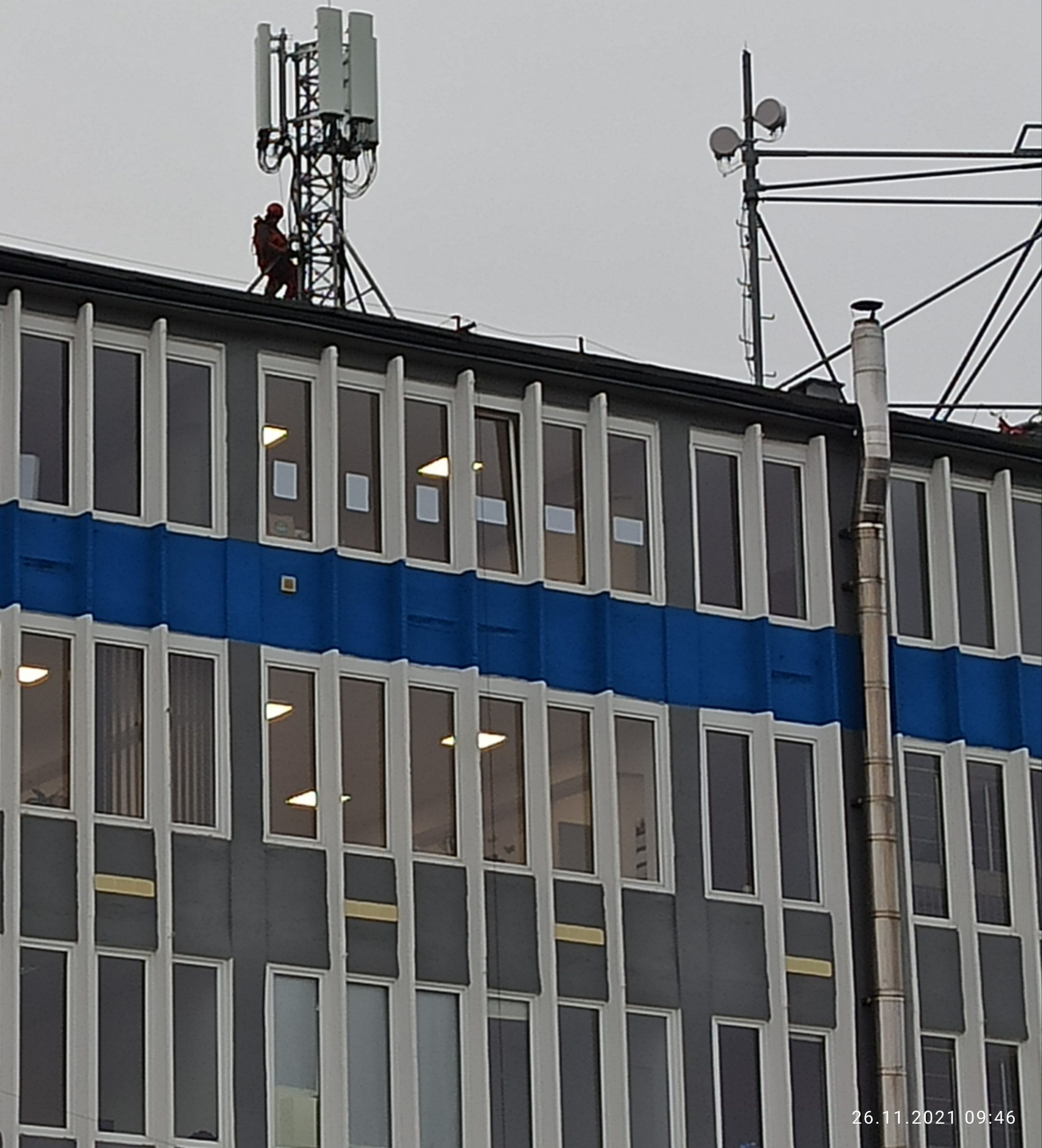 Jak wspominaliśmy we wcześniejszych informacjach naszego serwisu – lokalizacja stacji operatorów przy ul. Sobieskiego 53 w Jeleniej Górze jest w jakimś sensie pechową. Plus przez wiele lat jej nie rozbudowywał. Dziś, zresztą – mimo modernizacji do LTE1800 – wyniki transmisji danych z tej stacji ma bardzo mizerne. Ponadto, brakuje czwartego sektora z azymutem na nowe osiedle mieszkaniowe oraz linię kolejową do Zgorzelca. Z kolei w przypadku T-Mobile stacja również została w ostatnim czasie zmodernizowana, wymieniono anteny i rozszerzono ją o LTE800. Jak wskazywaliśmy w kilku ostatnich wpisach – jakość zrealizowanych prac mimo kilku etapów „poprawkowych” wciąż niekoniecznie przypomina tę wzorcową. Z radością możemy powiedzieć, że dziś od rana, na dachu budynku BGI „ZREMB” w Jeleniej Górze przy ul. Sobieskiego 53 trwają dalsze prace, które wykonuje duet pracowników. Instalacja jest porządkowana i wiele wskazuje na to, że na stacji wkrótce pojawi się również 5G DSS NSA operatora.