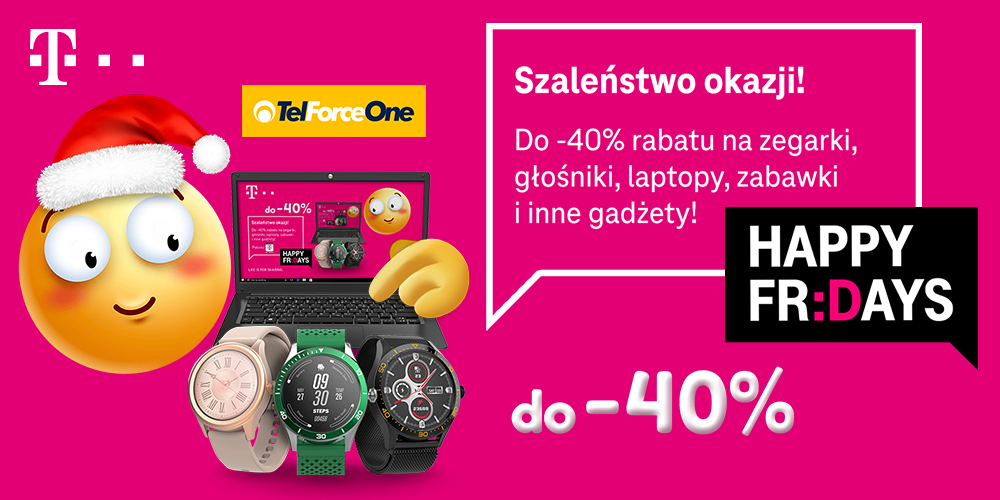 Happy Fridays w T-Mobile: akcesoria i produkty TelForceOne nawet 40% taniej. Czy czujesz już świąteczne szaleństwo? Dalej szukasz pomysłu na idealny prezenty? W T‑Mobile ułatwiamy naszym klientom indywidualnym przygotowania do świąt i zakup podarunków dla bliskich.