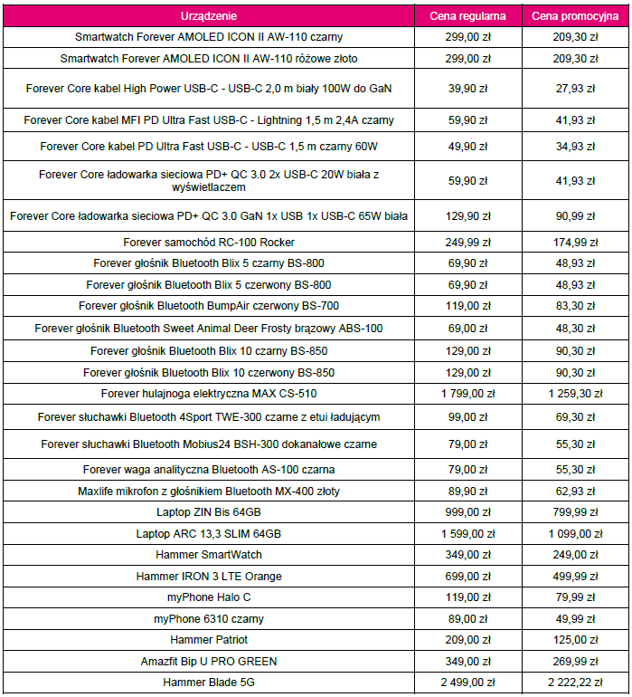 Aby skorzystać z promocji, wystarczy zalogować się do aplikacji „Mój T‑Mobile” w dniach 3-7 grudnia, a następnie kliknąć w link dotyczący akcji – zostaniemy wówczas przekierowani na stronę sklepu mPTech (grupa TelForceOne), gdzie znajdziemy wszystkie dostępne produkty objęte rabatem. Co więcej, w przypadku zamówień za minimum 100 zł dostawa jest bezpłatna. Bonus jest dostępny zarówno dla naszych klientów abonamentowych (T, T DATA, Rodzina), jak i użytkowników oferty na kartę (GO!, Frii, Hot, Happy) oraz MIX (Frii Mix). Produkty w promocyjnych cenach można zgarnąć do 12 grudnia lub do wyczerpania zapasów, więc nie ma co za długo zwlekać.