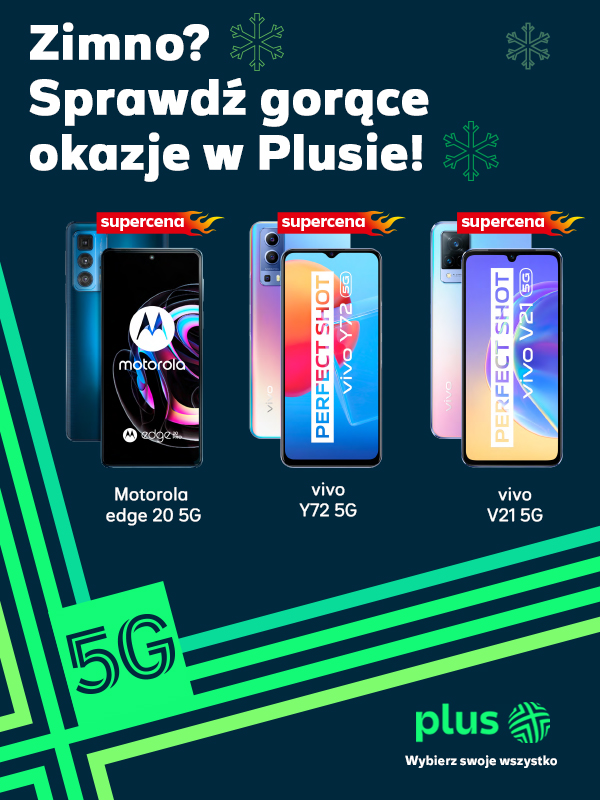Gorące okazje w Plusie – wyprzedaż smartfonów z dostępem do sieci 5G. Plus podnosi zimowe temperatury gorącymi wyprzedażami. Operator przygotował promocje na smartfony z dostępem do najszybszej sieci 5G. Wśród propozycji w supercenach znalazły się dwa modele vivo: Y72 5G oraz V21 5G, a także hit zimowej sprzedaży Motorola edge 20 5G.