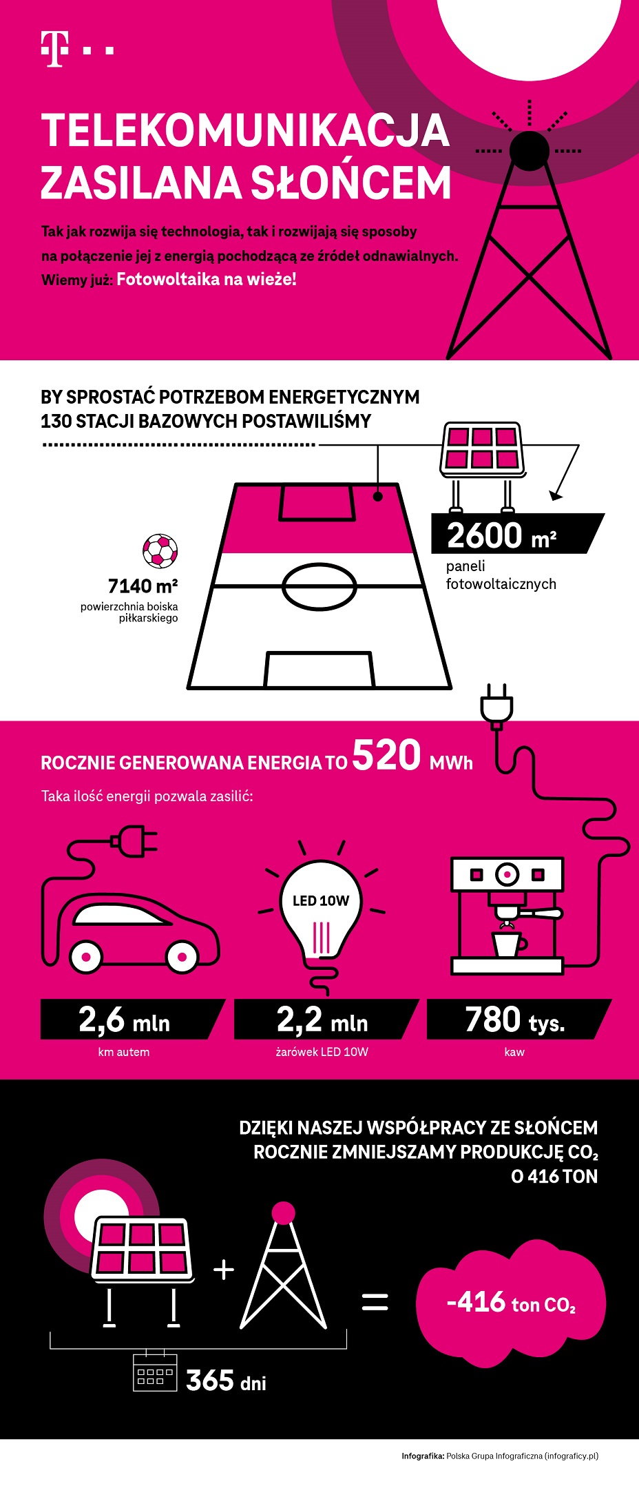 Już od 2018 r. instalacje pozyskujące energię ze słońca wykorzystujemy m.in. na stacji na Schronisku PTTK na Hali Ornak, w Dolinie Pięciu Stawów, gdzie skutecznie wspierają one funkcjonowanie obiektu pozbawionego dostępu do sieci energetycznej. Kolejne panele zostały zamontowane na terenie centrali telefonicznych w Lublinie i Rzeszowie oraz na 130 stacjach bazowych na terenie całego kraju. Testy, które T‑Mobile prowadzi w tym obszarze już od przeszło dwóch lat, pokazały, że panele fotowoltaiczne nie tylko pozwalają ulżyć środowisku, ale także wyraźnie obniżyć koszty energii. Zebrane na bazie istniejących instalacji dane pokazują, że panele fotowoltaiczne zapewniają ok. 15% średniorocznego zapotrzebowania stacji bazowej, a przy odpowiedniej konfiguracji i przy zastosowaniu magazynów energii udział energii ze słońca w całkowitym miksie energetycznym dla najlepszych pod tym względem obiektów może wynieść nawet 30%. Od początku projektu dzięki panelom fotowoltaicznym uzyskaliśmy ponad 210 megawatogodzin energii elektrycznej, co pozwoliło na zaoszczędzenie niemal 170 ton emisji CO2. W przyszłości niewykorzystana zielona energia będzie mogła być magazynowana w bateriach w obrębie stacji bazowej i będzie mogła być wykorzystana, gdy potrzeby energetyczne będą większe. W trosce o klimat, poza instalacją paneli fotowoltaicznych na naszych obiektach, realizujemy programy eliminacji plastiku i plastikowych toreb z naszych biur i salonów, ograniczamy zużycia papieru oraz stworzyliśmy inicjatywę „Magentowe Lasy”, w której zachęcamy klientów biznesowych do sadzenia z nami drzew zamian za rezygnację z papierowych faktur. W duchu filozofii zero waste stworzyliśmy także innowacyjny projekt „Smartfon re:generacja”, w ramach którego w można w naszej sieci nabyć odnowione, w pełni sprawne telefony z 2-letnią gwarancją, dając im drugie życie.