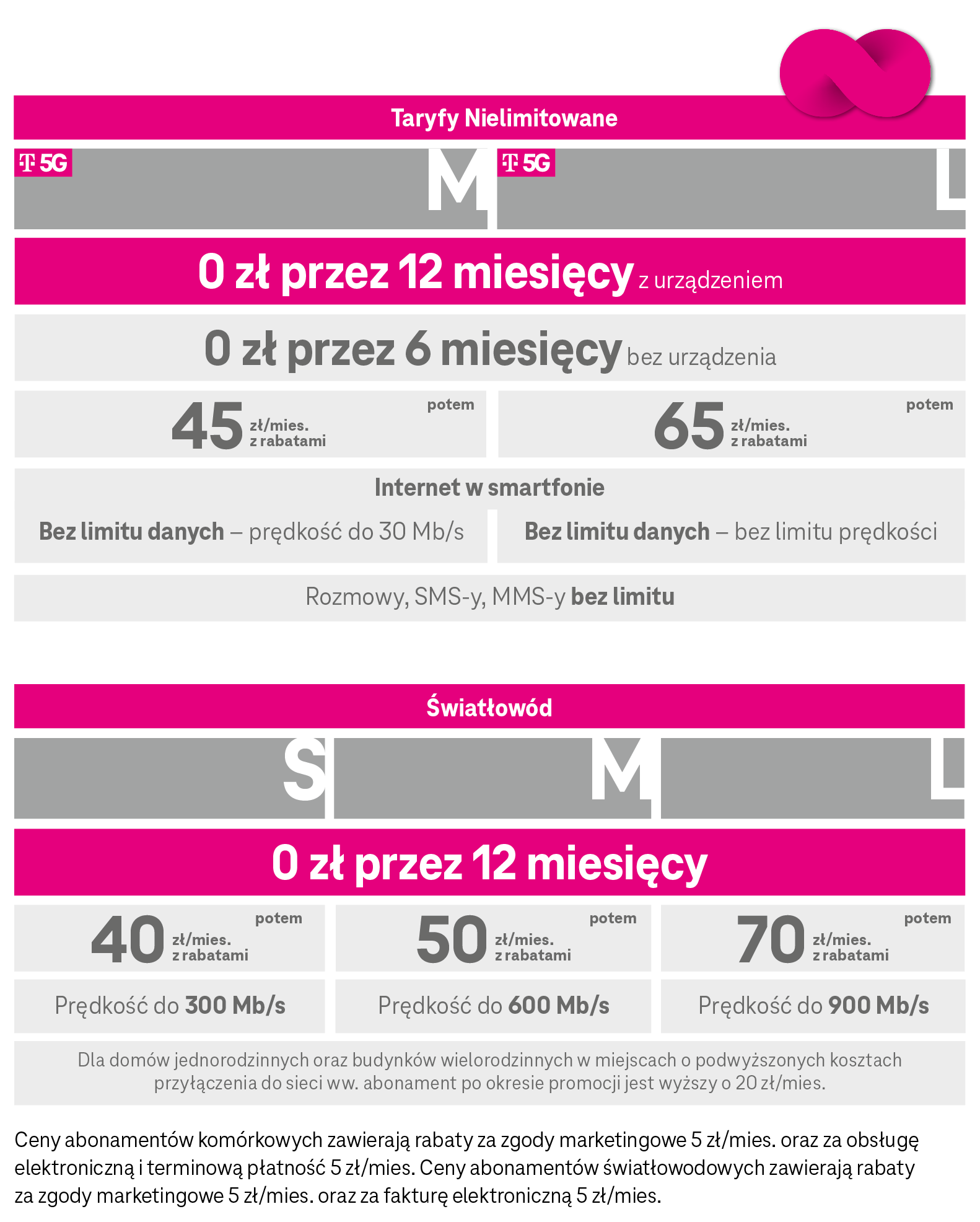 Oferta dotyczy klientów, którzy zdecydują się na jedną z ofert abonamentowych w T-Mobile z nielimitowanym internetem. Co w nich znajdziemy? W przypadku opcji „L Nielimitowana” są to rozmowy, SMS-y i MMS-y bez limitu oraz całkowicie nielimitowany internet 5G w maksymalnej, dostępnej prędkości, bez limitu pakietu danych do wykorzystania. Dodatkowo wyróżniającym plan taryfowy na rynku bonusem jest przysługująca zniżka na urządzenie w wysokości 300 zł. Do tego dodajemy dostęp do „Rozrywki Uwolnionej” na 12 miesięcy w prezencie. To jedyna usługa na rynku, która daje użytkownikom dostęp zarówno do telewizji, streamingu wideo z ulubionymi serialami i filmami, ebooków, jak i najlepszej muzyki. Na liście dostępnych serwisów znajdują się HBO GO, Tidal Premium, Legimi, Polsat Box Go i Eleven Sports, z których można naprzemiennie korzystać co 30 dni. Regularna cena taryfy „L Nielimitowana” to 85 zł miesięcznie, a jako kolejna usługa – 65 zł miesięcznie. Drugim wariantem oferty, do której można dobrać promocyjne usługi, jest „M Nielimitowana”. Podobnie jak L-ka, gwarantuje ona nielimitowane połączenia oraz wiadomości. Wliczony jest tu także internet bez limitu danych – w stałej, maksymalnej prędkości do 30 Mb/s. Nie zabrakło również 200-złotowej zniżki na smartfon oraz 6-miesięcznego dostępu do „Rozrywki Uwolnionej”. Abonament w tym wariancie kosztuje 65 zł miesięcznie, a jako kolejna usługa tylko 45 zł miesięcznie.