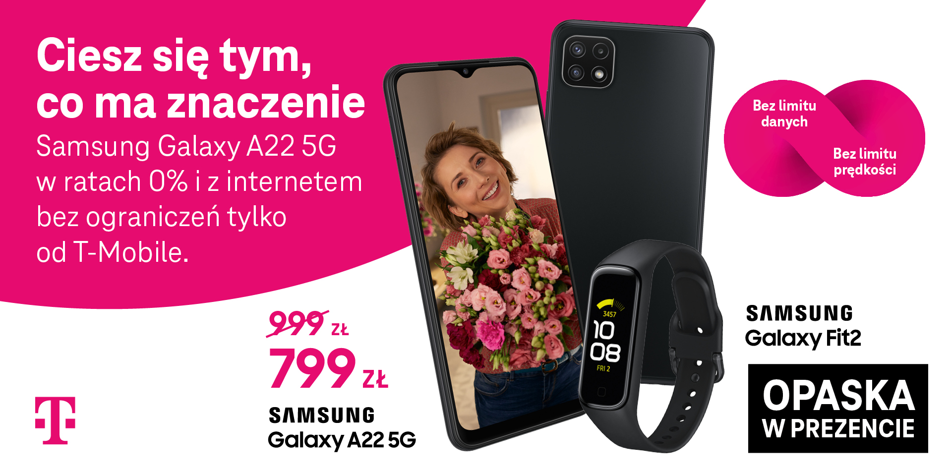 Kup Samsung Galaxy A22 5G w T-Mobile 200 zł taniej i odbierz opaskę Galaxy Fit2 w prezencie. Chciałbyś jeszcze lepiej zadbać o formę na wiosnę? Szukasz urządzenia, które pomoże Ci nie tylko być w kontakcie z bliskimi, ale także monitorować aktywność fizyczną? Dobrze się składa ponieważ w T-Mobile od 26 kwietnia można kupić telefon Samsung Galaxy A22 5G z internetem bez limitu danych nawet 200 zł taniej. Dodatkowo każdy klient, który zdecyduje się na ten model smartfona, otrzyma w prezencie opaskę Samsung Galaxy Fit2. Prędkość liczy się nie tylko podczas treningu na bieżni. Także w telefonie to niezwykle ważny aspekt. Dlatego teraz w T-Mobile można kupić smartfon Samsung Galaxy A22 5G, otrzymując w prezencie opaskę Samsung Galaxy Fit2, która z pewnością przyda się podczas treningów na siłowni lub na świeżym powietrzu. Dodatkowo, wybierając smartfon Samsung Galaxy A22 5G w taryfie S, M Nielimitowana i L Nielimitowana, klient otrzymuje zniżkę na urządzenie, która wynosi odpowiednio 100, 200 i 300 zł. Smartfon można nabyć w systemie ratalnym 0%.