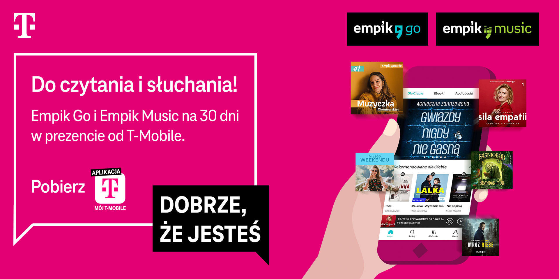Empik Go i Empik Music bezpłatnie na 30 dni od T-Mobile. Podróż pociągiem, trening w parku czy codzienny przejazd do pracy przestają się dłużyć, jeśli tylko towarzyszą im wciągające audiobooki, znakomicie napisane ebooki lub energetyczna muzyka. Ze wszystkich tych możliwości mogą teraz skorzystać klienci T‑Mobile, którzy otrzymają pełen dostęp do książek, podcastów, komiksów i utworów muzycznych w ramach subskrypcji usług Empik Go i Empik Music. Prezent obejmuje możliwość bezpłatnego korzystania z obu aplikacji przez 30 dni. Można go odebrać w aplikacji „Mój T‑Mobile” od 13 do 17 maja. Podczas urlopu i w trakcie sprzątania, w przerwie na kawę i wtedy, gdy gotujemy – aplikacje zapewniające dostęp do audiobooków, ebooków, podcastów, seriali audio czy muzyki sprawdzają się świetnie. Dlatego dla naszych klientów indywidualnych, w ramach kolejnej odsłony „Dobrze, że jesteś”, przygotowaliśmy prezent w postaci 30-dniowego, bezpłatnego dostępu do subskrypcji Empik Go Max i Empik Music do odebrania w aplikacji „Mój T‑Mobile”.