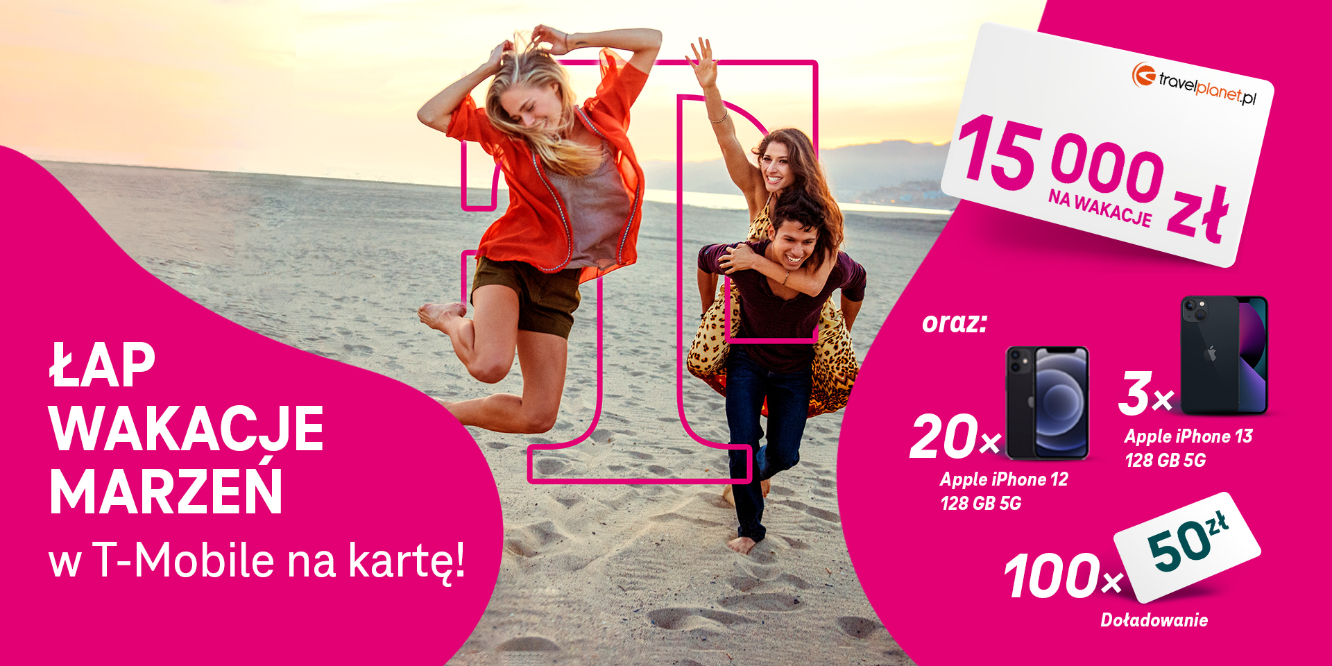Startuje kolejna edycja konkursu „Łap wakacje marzeń z T-Mobile”. Słońce, plaża…a może góry? – zbliżające się lato zachęca do snucia wakacyjnych planów. A letni klimat już dziś mogą poczuć klienci T‑Mobile na kartę, Heyah na kartę oraz MIX, ponieważ już dzisiaj, 24 maja, ruszamy z kolejną letnią edycją konkursu doładowań o nazwie: „Łap wakacje marzeń z T‑Mobile”, w którym do wygrania jest voucher o wartości 15 000 zł na wymarzone wakacje oraz wiele innych atrakcyjnych nagród. Wiele osób snuje już wakacyjne plany i surfuje w internecie poszukując inspiracji na tegoroczne podróże. Jakie destynacje będą najpopularniejsze w tym roku? Tego dowiemy się za kilka miesięcy, ale już teraz w T‑Mobile wiemy jak sprawić, żeby ten letni wyjazd był spełnieniem marzeń – ruszamy z konkursem, w którym do wygrania jest voucher (lub ekwiwalent pieniężny) o wartości 15 000 zł do wykorzystania na wybraną podróż dostępną na stronie: