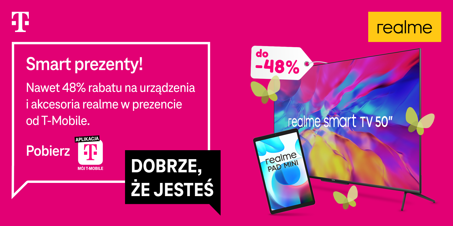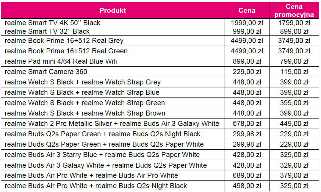 Odbierz do 48% rabatu od T-Mobile na wybrane urządzenia i akcesoria realme. W czerwcu nie brakuje okazji, aby obdarować kogoś prezentem – Dzień Dziecka, Dzień Ojca, a nawet zakończenie roku szkolnego to dobre momenty na wręczenie wyjątkowej niespodzianki. Dla klientów indywidualnych T-Mobile, którzy szukają pomysłów na upominki technologiczne, przygotowaliśmy nawet do 48% zniżki na urządzenia i akcesoria marki realme. Kod rabatowy można odebrać w aplikacji „Mój T-Mobile” od 27 do 31 maja, a zakupy będzie można zrealizować do 4 czerwca. Bezprzewodowe słuchawki, designerski smartwatch, mały, ale wytrzymały tablet dla dziecka? A może nowoczesny laptop przydatny zarówno dla młodszych, jak i starszych? Albo telewizor wyposażony w asystenta głosowego dla taty? Wybór idealnego prezentu – zwłaszcza dla znawców nowych technologii – nie jest łatwy, ale w T-Mobile możesz mieć jeszcze więcej. W ramach nowej oferty promocyjnej oferujemy 17 różnorodnych produktów i akcesoriów marki realme, które nasi klienci mogą nabyć nawet z 48% zniżką.