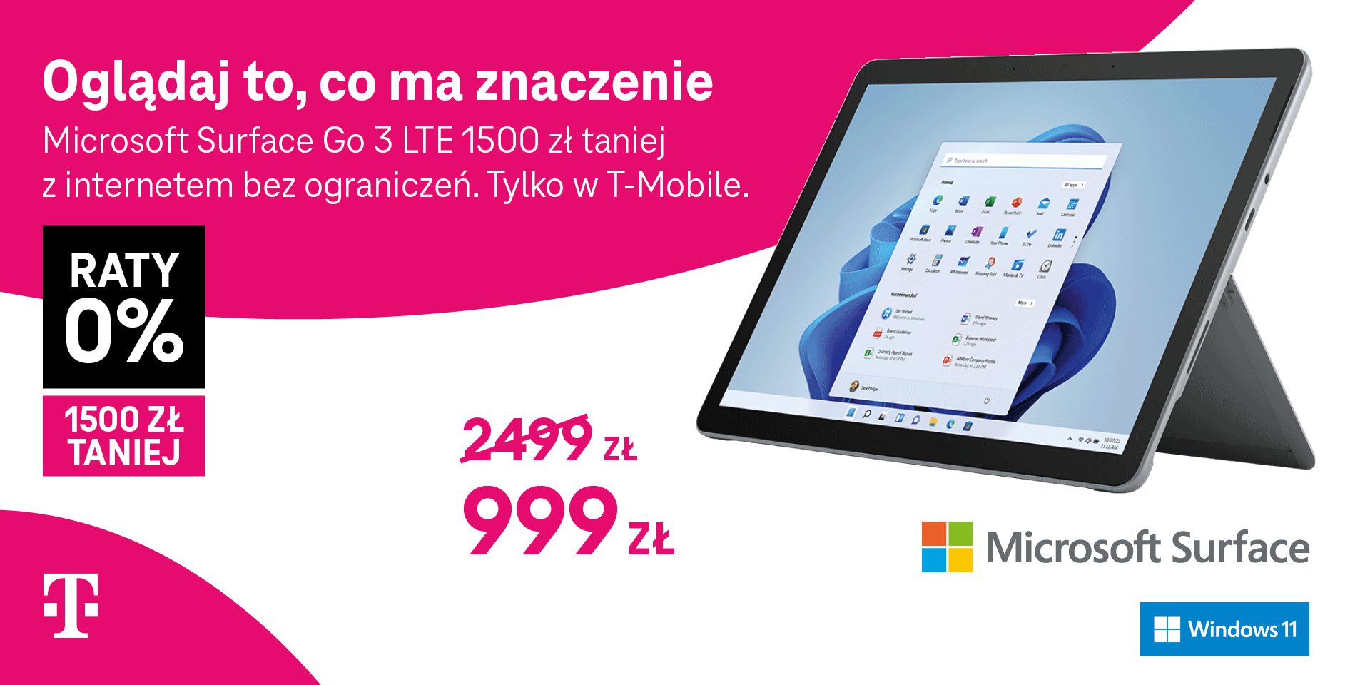 Microsoft Surface Go 3 LTE to 10,5-calowe urządzenie, działające w oparciu o system Windows 11, które doskonale sprawdza się w pracy i w nauce. Obsługuje ono m.in. kartę e-sim, dodatkową kartę pamięci, technologię Bluetooth, a także sieci LTE czy Wi-Fi 6, co sprawia, że można je wykorzystać do wielu różnych zastosowań i wygodnie połączyć z innymi akcesoriami. Osoby, które wybiorą ofertę dostępną w T-Mobile z nielimitowanym abonamentem 5G w smartfonie w taryfie „L Nielimitowana” zapłacą za sprzęt jedynie 999 zł – po sporej, 1500-złotowej obniżce z 2499 zł, w 24 ratach 0%. Cena w taryfie „M Nielimitowana: wyniesie zaś 1099 zł. Oferty „M Nielimitowana” oraz „L Nielimitowana” gwarantują nielimitowany dostęp do usług telekomunikacyjnych – połączeń, SMS-ów i MMS-ów. Dodatkowo zaś umożliwiają korzystanie z internetu na urządzeniu w błyskawicznej sieci 5G bez limitu danych do zużycia. W przypadku wariantu L klienci skorzystają z sieci w maksymalnej dostępnej prędkości, natomiast dla wersji M jest to maks. 30 Mb/s. Ponadto, w ramach bonusu, użytkownicy, którzy wybiorą jedną z propozycji abonamentowych, mogą liczyć na 6- lub 12-miesięczny dostęp do usługi „Rozrywka Uwolniona”, pozwalającej co miesiąc decydować, z której popularnej platformy streamingowej klient chce korzystać. Osobom, które wybiorą „M-kę” lub „L-kę”, przysługuje również rabat na urządzenie w wysokości kolejno – 200 zł lub 300 zł. Dodatkowo oba abonamenty objęte są wiosenną promocją w T-Mobile, w ramach której do końca czerwca można dobrać drugi abonament lub usługę internetu światłowodowego za 0 zł nawet na rok.