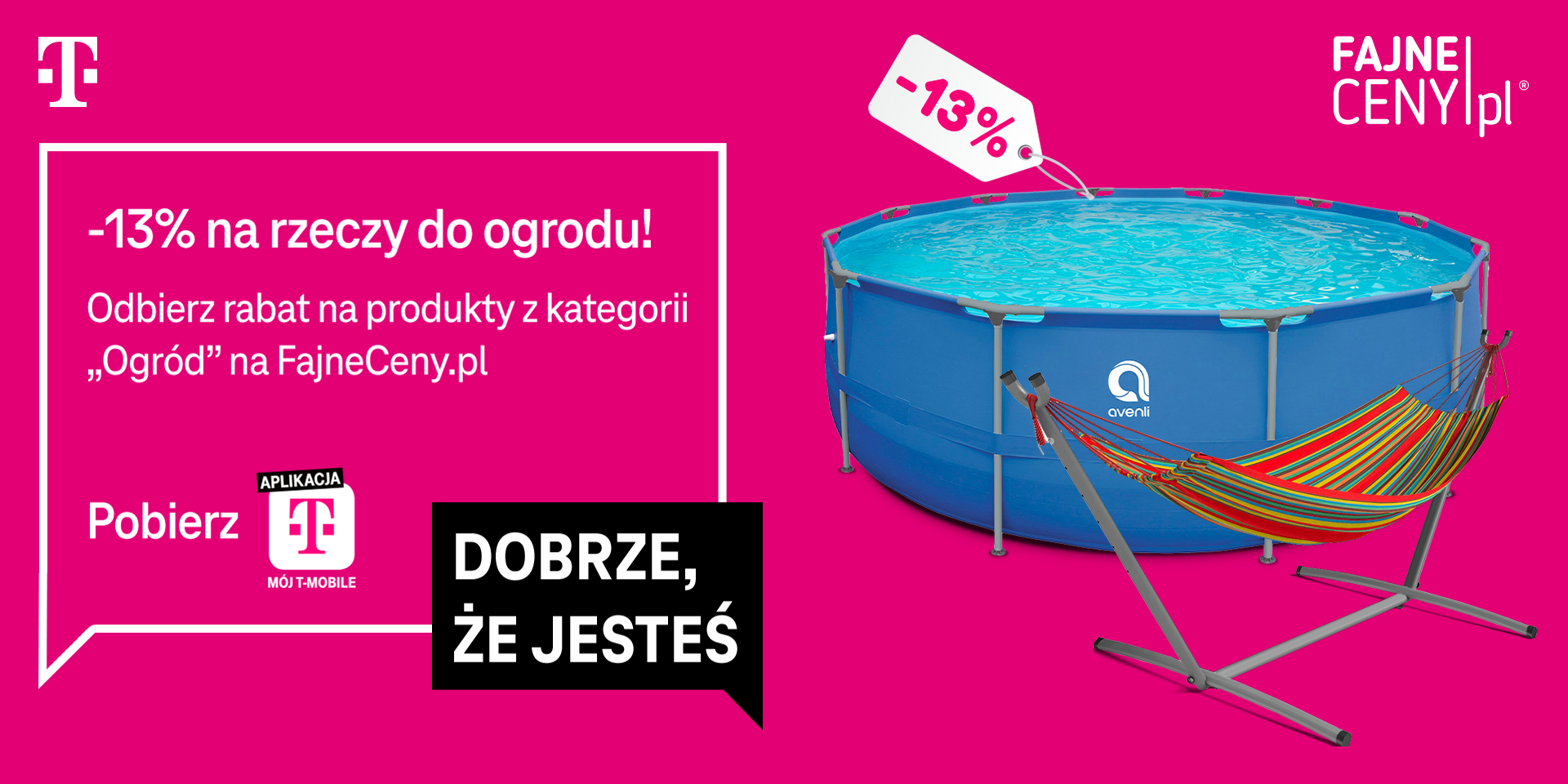 Zmień swój ogród i odbierz od T-Mobile zniżkę na zakupy w FajneCeny.pl. Technologia towarzyszy nam obecnie w każdym momencie naszego życia, ale czasami warto od niej odpocząć i rozkoszować się czasem wolnym w ogrodzie lub na tarasie. Dlatego w ramach najnowszej odsłony „Dobrze, że jesteś” użytkownicy indywidualni T-Mobile mogą zrobić zakupy na stronie www.FajneCeny.pl w kategorii „OGRÓD” z 13-procentowym rabatem. Prezent można odebrać od 15 do 21 czerwca w aplikacji „Mój T-Mobile”. Lato to czas wytchnienia i odpoczynku. Często kojarzy się z leniwymi popołudniami i spędzaniem czasu na świeżym powietrzu w gronie rodzinnym, na przykład na tarasie czy w ogrodzie. W T-Mobile dostarczmy nie tylko technologie, ale dajemy również możliwości umielenia sobie wakacyjnych chwil. Huśtawka, basen, meble czy szklarnia, gdzie będzie można posadzić warzywa lub owoce, to niezbędne elementy dla fanów ogródkowych tematów. Dlatego w tym tygodniu klienci T-Mobile będą mogli zamówić wybrane wyposażenie ogrodowe z 13-procentowym rabatem i jeszcze lepiej zaaranżować swoją przestrzeń.