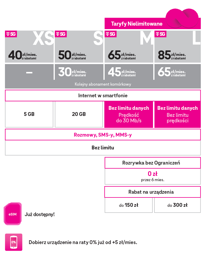 Nie lubisz ograniczeń? Mamy dla Ciebie znane już dwie taryfy z nielimitowanym dostępem do internetu 5G w smartfonie – M za 65 zł oraz L za 85 zł, cieszące się dużą popularnością. To jedyna taka prawdziwie nielimitowana oferta na rynku. W obu przypadkach użytkownik otrzymuje nielimitowane rozmowy, SMS-y i MMS-y oraz nieograniczony limitem GB dostęp do sieci 5G w smartfonie. W wariancie M działa on z prędkością do 30 Mb/s, natomiast w wersji L – w maksymalnej dostępnej prędkości. Oba pakiety zapewniają dodatkowo 6-miesięczny bezpłatny dostęp do „Rozrywki bez Ograniczeń” – usługi umożliwiającej korzystanie z platform streamingowych z książkami, muzyką, filmami czy programami, która pozwala na wybór tej samej lub innej platformy co miesiąc. „M-ka” i „L-ka” to także 20-złotowe zniżki na kolejny abonament w ramach programu „Korzyści dla Domu”. Oznacza to, że za kolejną kartę SIM w „M Nielimitowana” klient zapłaci 45 zł miesięcznie, z kolei w „L Nielimitowana” – 65 zł miesięcznie. Oferty obejmują również rabaty na urządzenia w przypadku rat 0% na 24 miesiące. Wynoszą one kolejno 150 i 300 zł. Co więcej, przy wyborze dwóch ofert nielimitowanych tego samego dnia klient otrzymuje dodatkowe 100 zł rabatu na urządzenie. Dla tych, którzy nie potrzebują dużego zapasu internetu, stworzyliśmy nowy wariant oferty XS. W cenie 40 zł klienci znajdą rozmowy, SMS-y i MMS-y bez limitu, dodatkowo zaś pakiet 5 GB internetu. Osoby, które poszukują większego pakietu, mogą z kolei skorzystać z oferty S, której cena wynosi 50 zł. W tym wypadku otrzymają nielimitowane połączenia, SMS-y i MMS-y, jak również paczkę wielkości 20 GB. A jeśli zdecydują się na kolejny numer w ramach oferty S, zapłacą za niego jedynie 30 zł. Oba warianty gwarantują dostęp do 5G. Do każdej oferty można dobrać dowolne urządzenie na elastyczne raty 0% na 24 lub 36 miesięcy. A dodatkowo, wybierając taryfy nielimitowane, otrzymujemy atrakcyjny rabat na pierwszą wpłatę (w opcji na 24 miesiące).