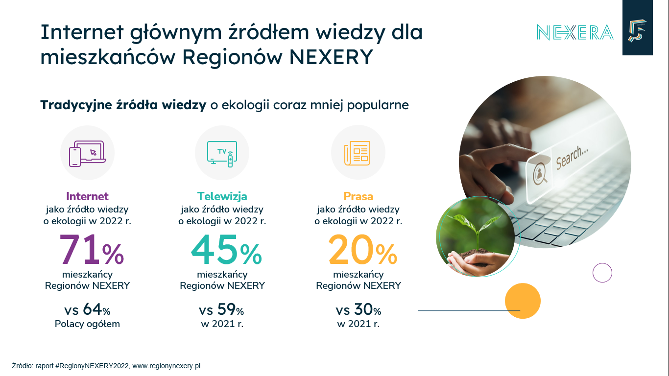 Aż 50 proc. ankietowanych mieszkańców Regionów Nexery docenia szybki internet ze względu na łatwość poszerzania wiedzy – także na tematy związane ze zrównoważonym rozwojem. Z badań operatora wynika również, że tradycyjne źródła informacji o ekologii są coraz mniej popularne. Zdecydowana większość (71 proc.) respondentów zdobywa główne przekazy o ochronie środowiska z różnego rodzaju publikacji w internecie – to o 7 punktów procentowych więcej niż w porównaniu z ogółem Polaków. Badani za to coraz rzadziej wskazują telewizję jako podstawowe źródło wiedzy na tematy ekologiczne – w tym zakresie nastąpił spadek z 59 proc. w 2021 roku do 45 proc. w bieżącym roku. Tylko 20 proc. ankietowanych czyta o ochronie środowiska w prasie – o 10 punktów proc. mniej r/r. – Niewątpliwie do zmiany zachowania społeczeństwa w kontekście dbałości o środowisko niezbędny jest dostęp do bieżących informacji.