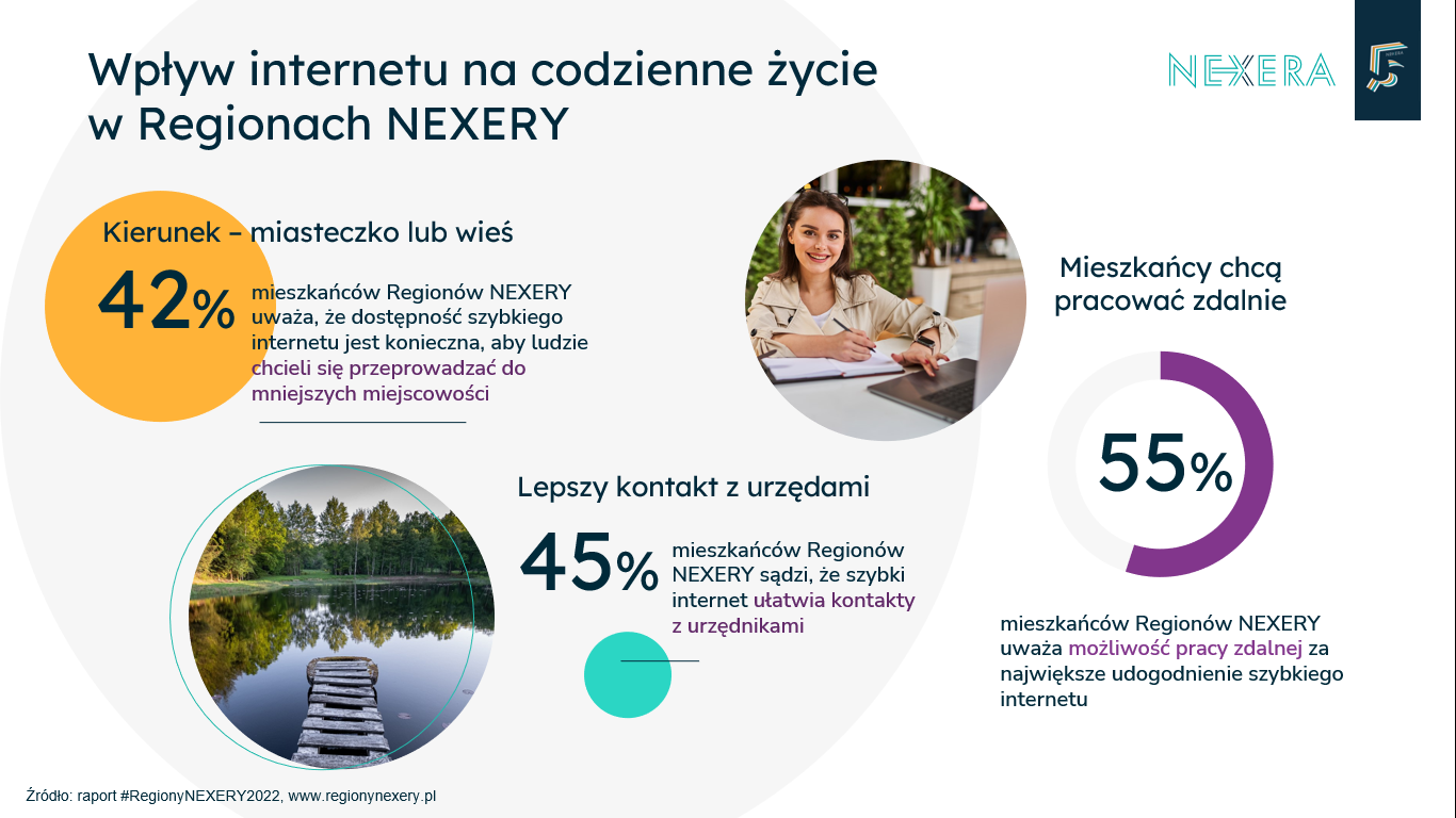 Mobilność, praca, wiedza. Jak internet wpływa na codzienność polskich miasteczek i wsi? Nexera prezentuje najnowsze wyniki czwartej edycji badania #RegionyNEXERY2022. Czy szybki internet ułatwia kontakty z urzędami? Czy wpływa na chęć przeprowadzki z dużych aglomeracji do małych miasteczek i wsi? Niewątpliwie dostęp do szerokopasmowego łącza okazuje się coraz bardziej niezbędny, ale jakie jest jego znaczenie w naszej codzienności? Nexera, wraz z GfK Polonia, zapytała o to mieszkańców terenów, na których operator buduje i rozwija infrastrukturę światłowodową. Powstały raport to już czwarta edycja opracowania, jednak po raz pierwszy wydano go wyłącznie w formie cyfrowej, zgodnie z proekologicznym podejściem paperless.