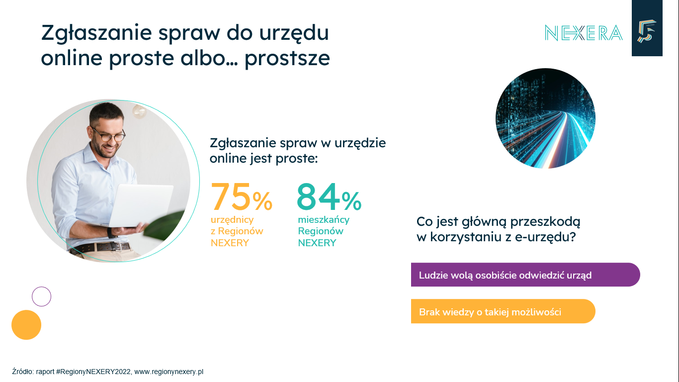 Szybki internet znacząco ułatwia kontakty z urzędami – taką opinię wyraziło 45 proc. badanych mieszkańców Regionów Nexery. Ponadto, coraz więcej (75 proc.) urzędników ocenia zgłaszanie spraw administracyjnych online jako proste, co daje wzrost o 7 punktów procentowych rok do roku. Co ciekawe, takiego zdania jest jeszcze więcej badanych użytkowników (84 proc.). To oznacza, że korzystający z e-urzędów pozytywniej oceniają ich funkcjonowanie, niż sami urzędnicy, Największe bariery w załatwianiu spraw urzędowych przez internet to, według obu grup, brak wiedzy o e-usługach urzędu oraz fakt, że ludzie nadal preferują osobiste wizyty w placówkach administracyjnych.
