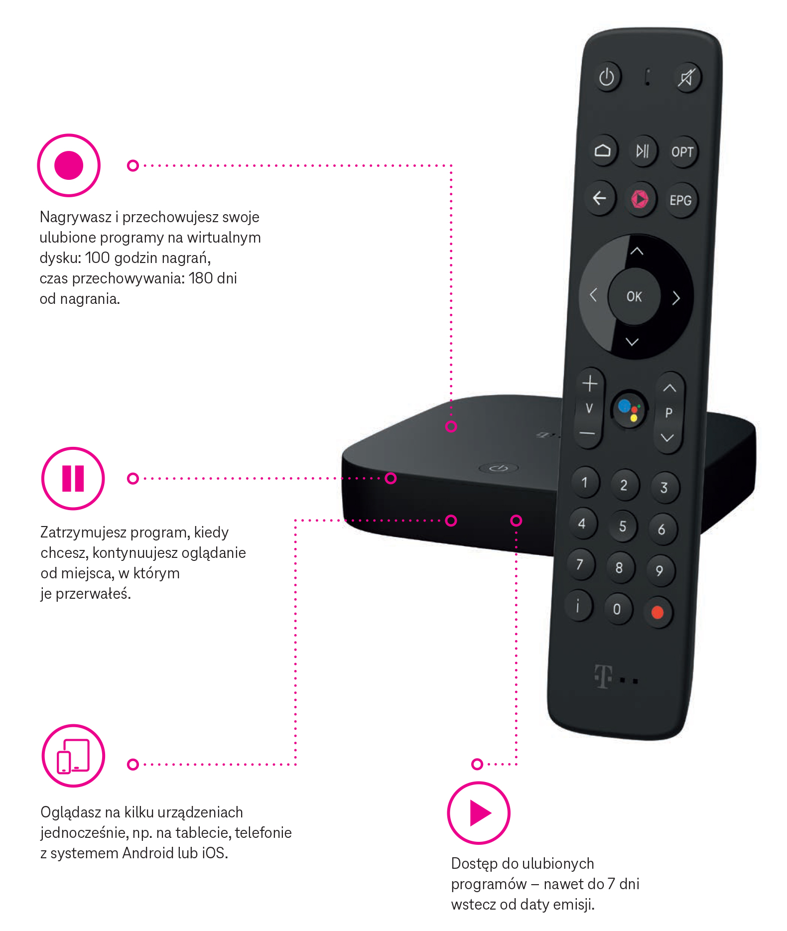 Dodatkowo z ofertą telewizji za 1 zł użytkownik otrzymuje nowoczesny dekoder, który – poza korzystaniem z pakietu telewizyjnego w ramach oferty Magenta Dom – daje także dostęp do bogatego świata aplikacji i usług Android TV. Tym samym klienci mogą korzystać także z wielu różnorodnych serwisów i platform, m.in. HBO Max, a dzięki dostępnym funkcjom smart ulubione seriale czy filmy będą dostępne w dogodnym dla nich momencie. Dodatkowo klient nie musi łączyć dekodera wyłącznie z usługą Magenta Dom – może z jego pomocą korzystać z serwisów, które już posiada lub kupuje okazjonalnie. Urządzenie pozwala także na nagrywanie i przechowywanie do 100 godzin nagrań do 180 dni od nagrania oraz daje dostęp do programów wyemitowanych nawet 7 dni wstecz.