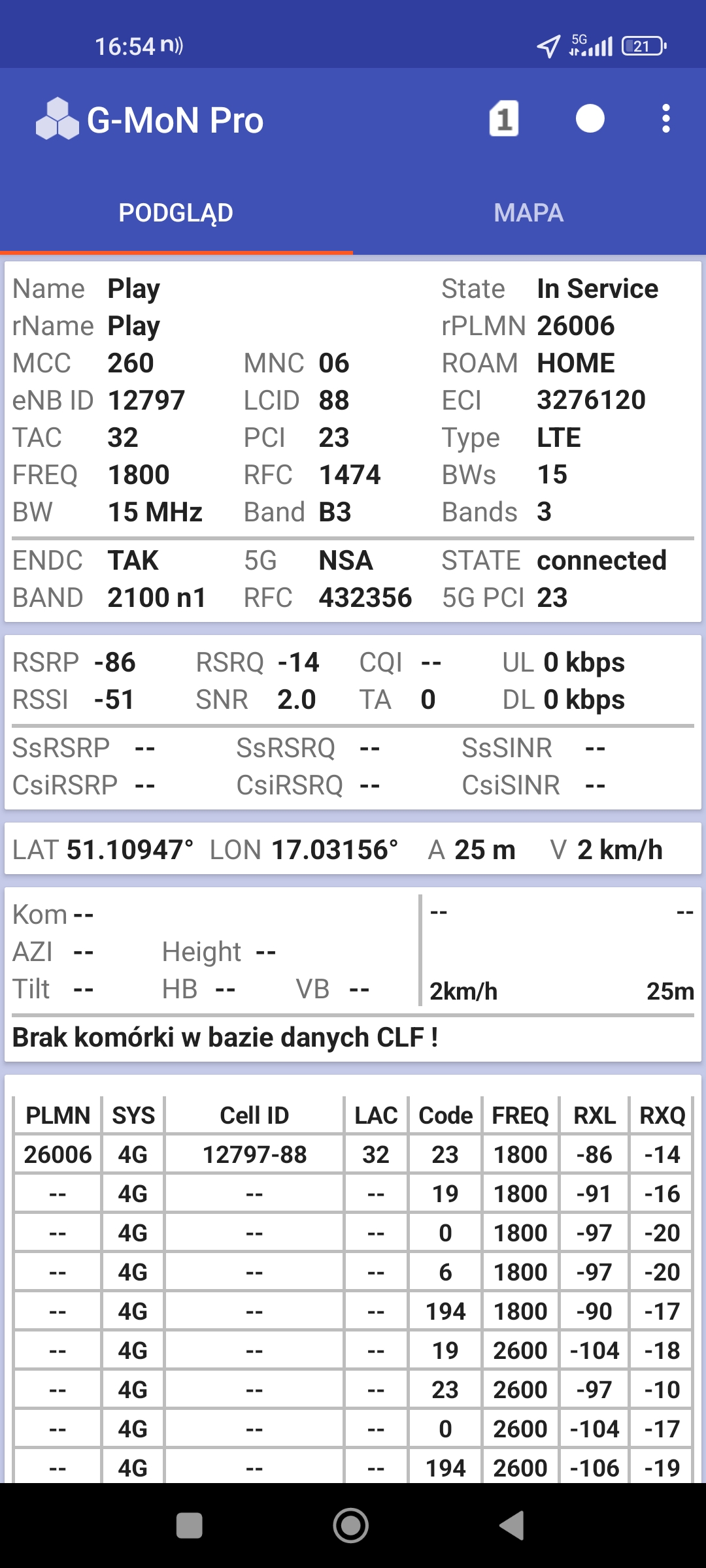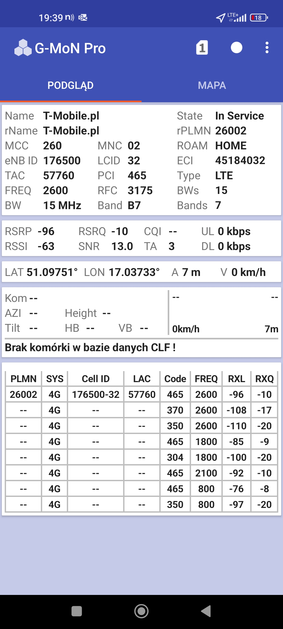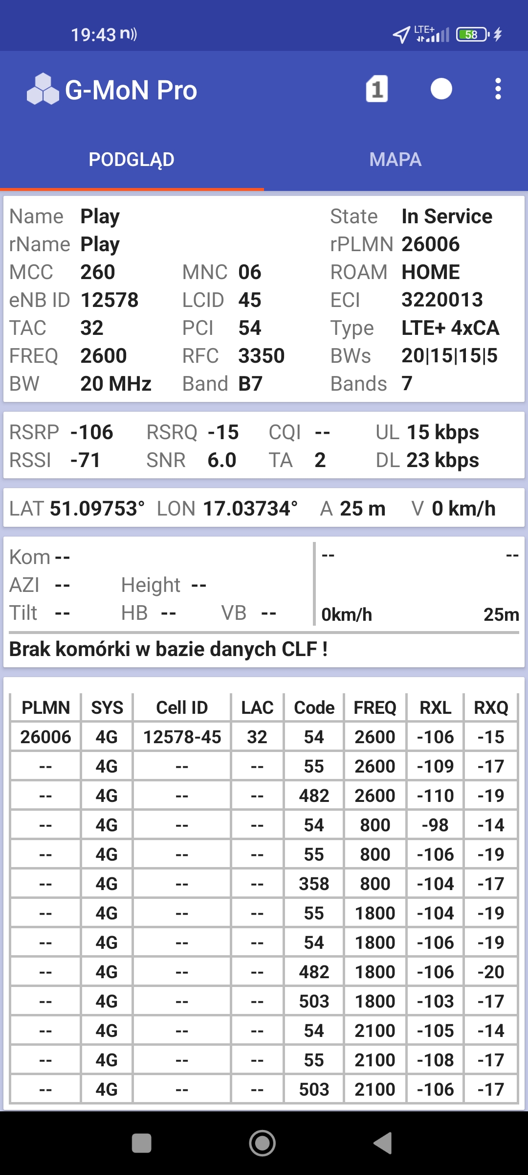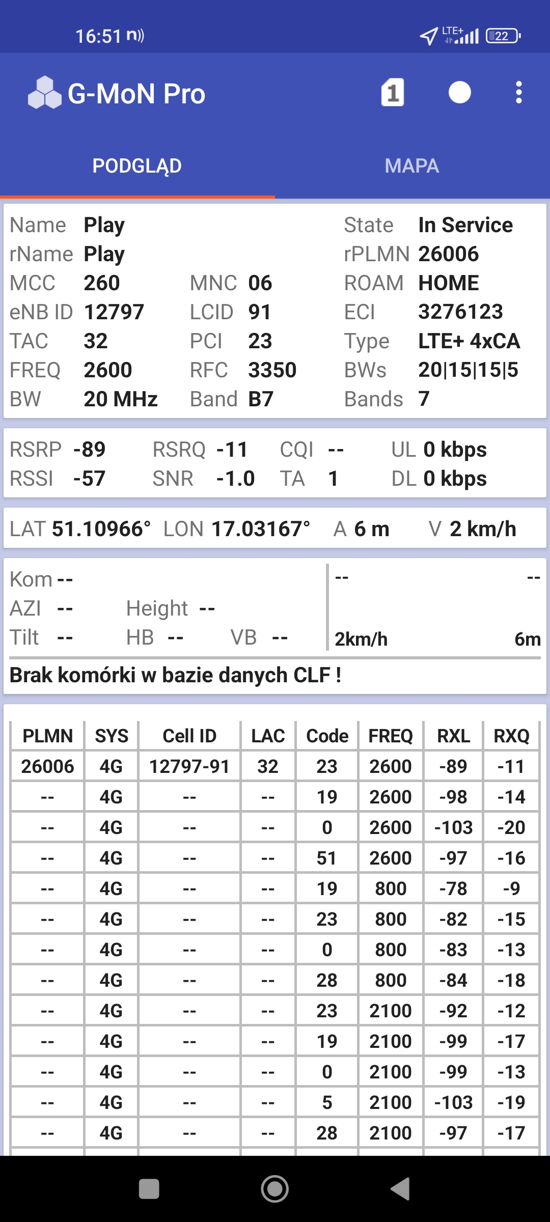 Jak widać na zaprezentowanych zrzutach ekranów, statystycznie najlepiej sprawowały się sieci operatorów globalnych. Przyjmując nawet mniejszą dostępność segmentu 5G, aniżeli u Plusa czy w Play – nie ma to znaczenia dla świadczonych dla klienta usług, ponieważ w momencie, kiedy operatorzy gwarantują zasięg LTE – gwarantują w zdecydowanej większości pożądaną jakość usług, konkurencyjną do segmentu 5G Plusa, który dla 5G posiada dedykowaną część pasma. Kuriozalną sytuację na dworcu Wrocław Główny wciąż posiada Plus. Operator dysponuje w stolicy Dolnego Śląska również stacjami, pracującymi z jednym pasmem LTE. Przeważnie jest to LTE1800. Jak wspominaliśmy na wstępie bieżącej informacji – prędkości, które dziś proponuje przy transmisji danych Play są niewspółmiernie niskie wobec tych, które były jeszcze kilka miesięcy temu. Ponieważ większość stacji jest wyposażona w komplet pasm, a stacji bazowych we Wrocławiu jest bardzo dużo – w tym miejscu kolejny raz można wrócić do piętrzących się od lat zaniedbań w jakości zarządzania siecią i w jej parametryzacji.