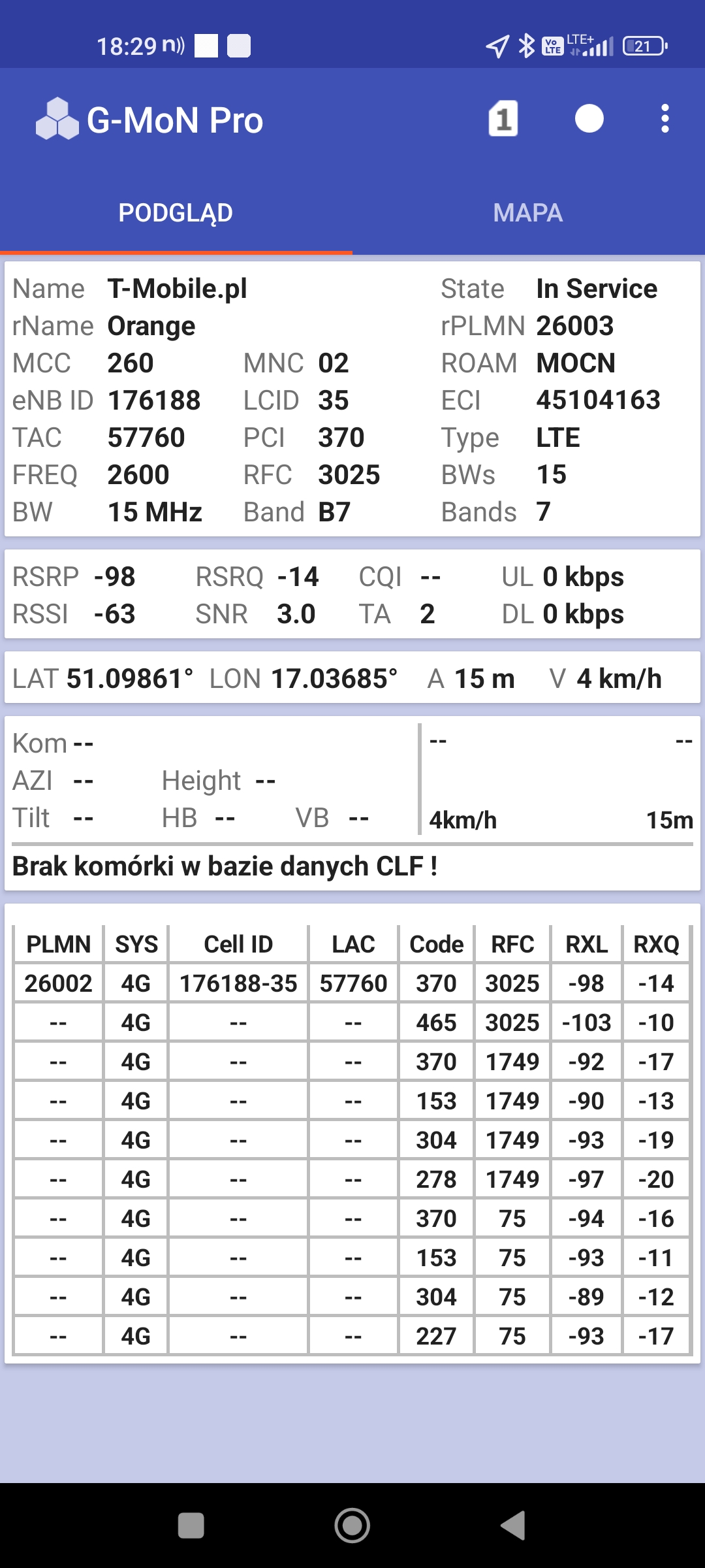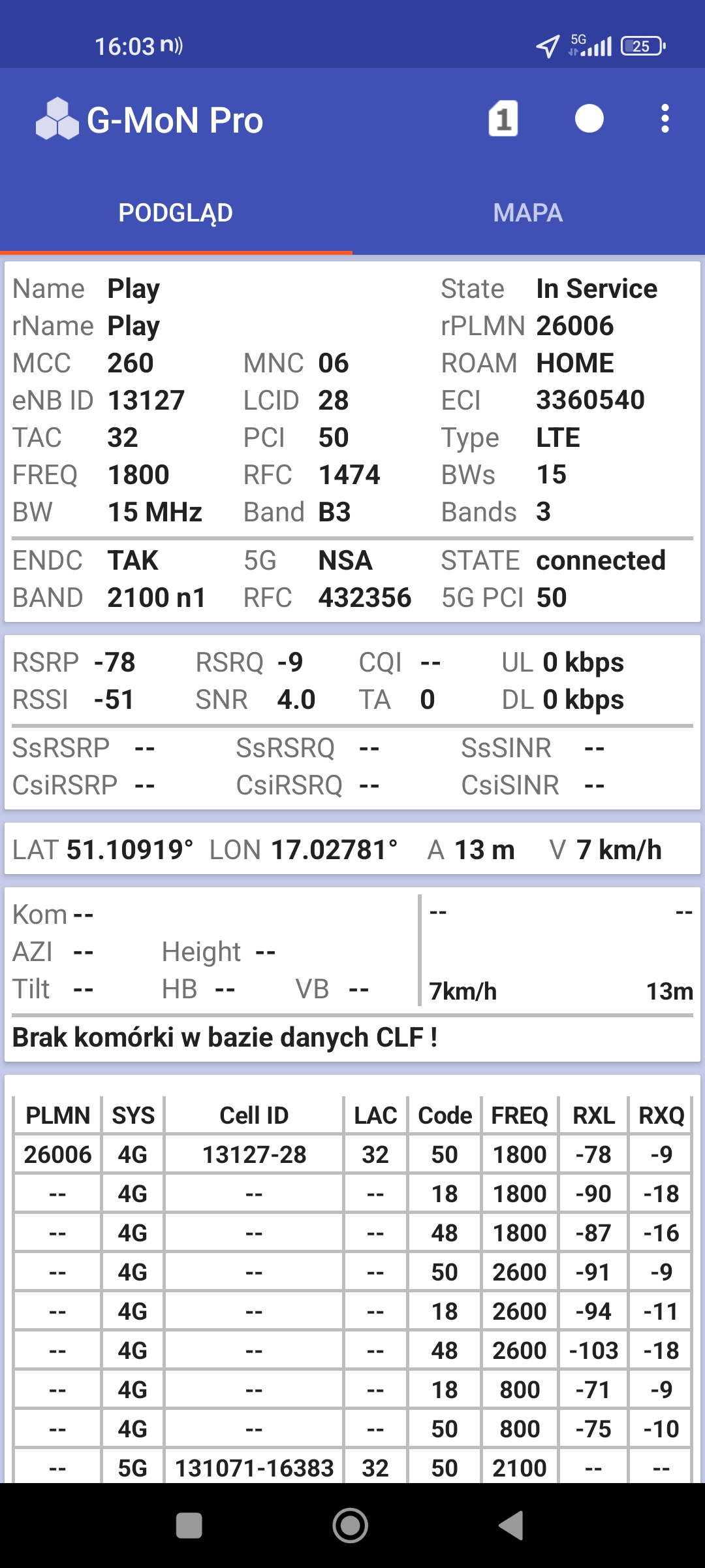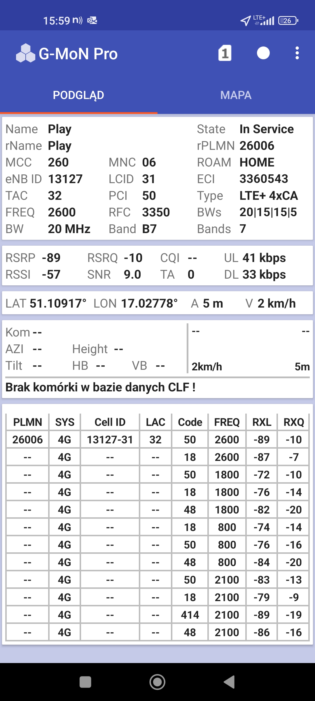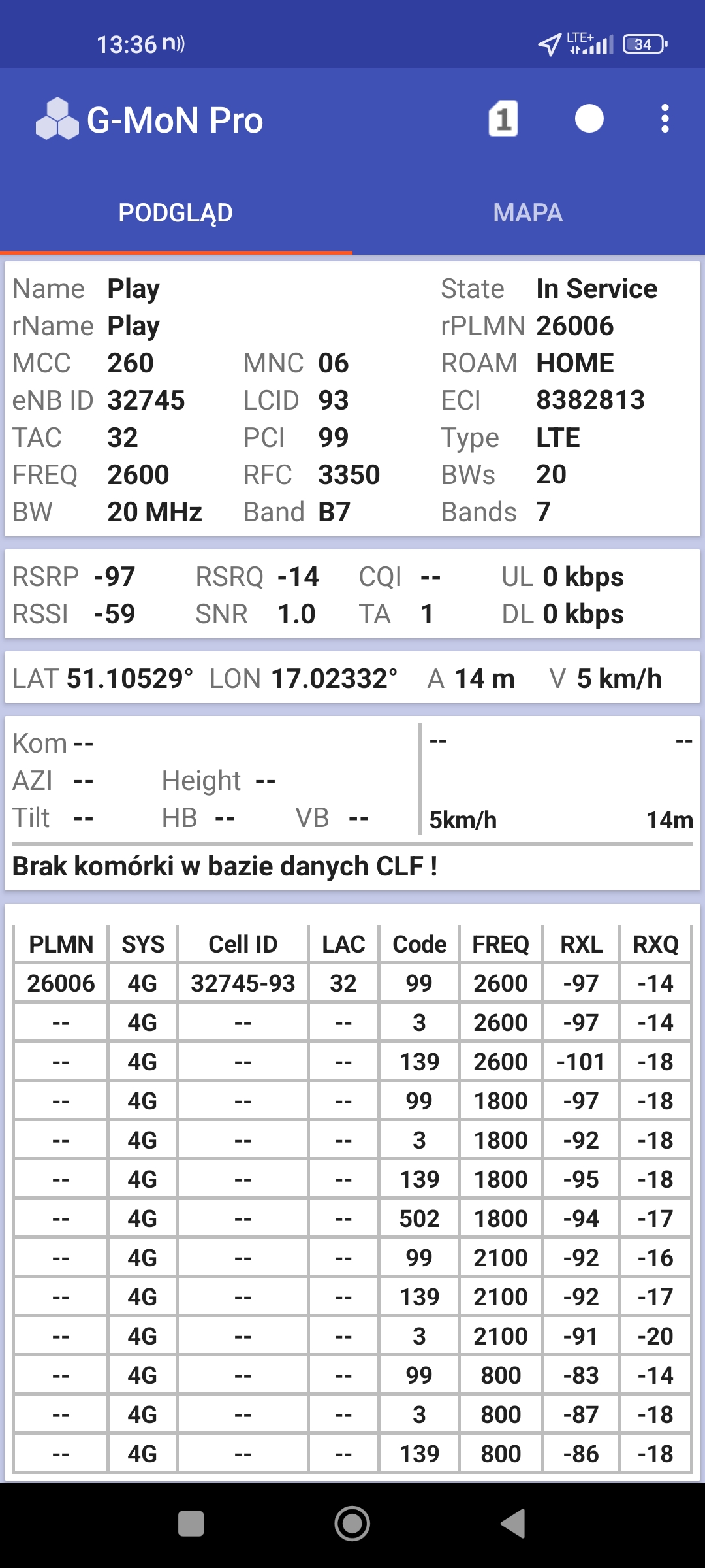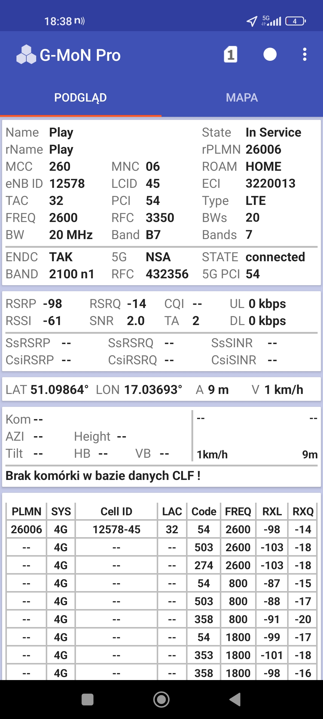 Jak widać na zaprezentowanych zrzutach ekranów, statystycznie najlepiej sprawowały się sieci operatorów globalnych. Przyjmując nawet mniejszą dostępność segmentu 5G, aniżeli u Plusa czy w Play – nie ma to znaczenia dla świadczonych dla klienta usług, ponieważ w momencie, kiedy operatorzy gwarantują zasięg LTE – gwarantują w zdecydowanej większości pożądaną jakość usług, konkurencyjną do segmentu 5G Plusa, który dla 5G posiada dedykowaną część pasma. Kuriozalną sytuację na dworcu Wrocław Główny wciąż posiada Plus. Operator dysponuje w stolicy Dolnego Śląska również stacjami, pracującymi z jednym pasmem LTE. Przeważnie jest to LTE1800. Jak wspominaliśmy na wstępie bieżącej informacji – prędkości, które dziś proponuje przy transmisji danych Play są niewspółmiernie niskie wobec tych, które były jeszcze kilka miesięcy temu. Ponieważ większość stacji jest wyposażona w komplet pasm, a stacji bazowych we Wrocławiu jest bardzo dużo – w tym miejscu kolejny raz można wrócić do piętrzących się od lat zaniedbań w jakości zarządzania siecią i w jej parametryzacji.