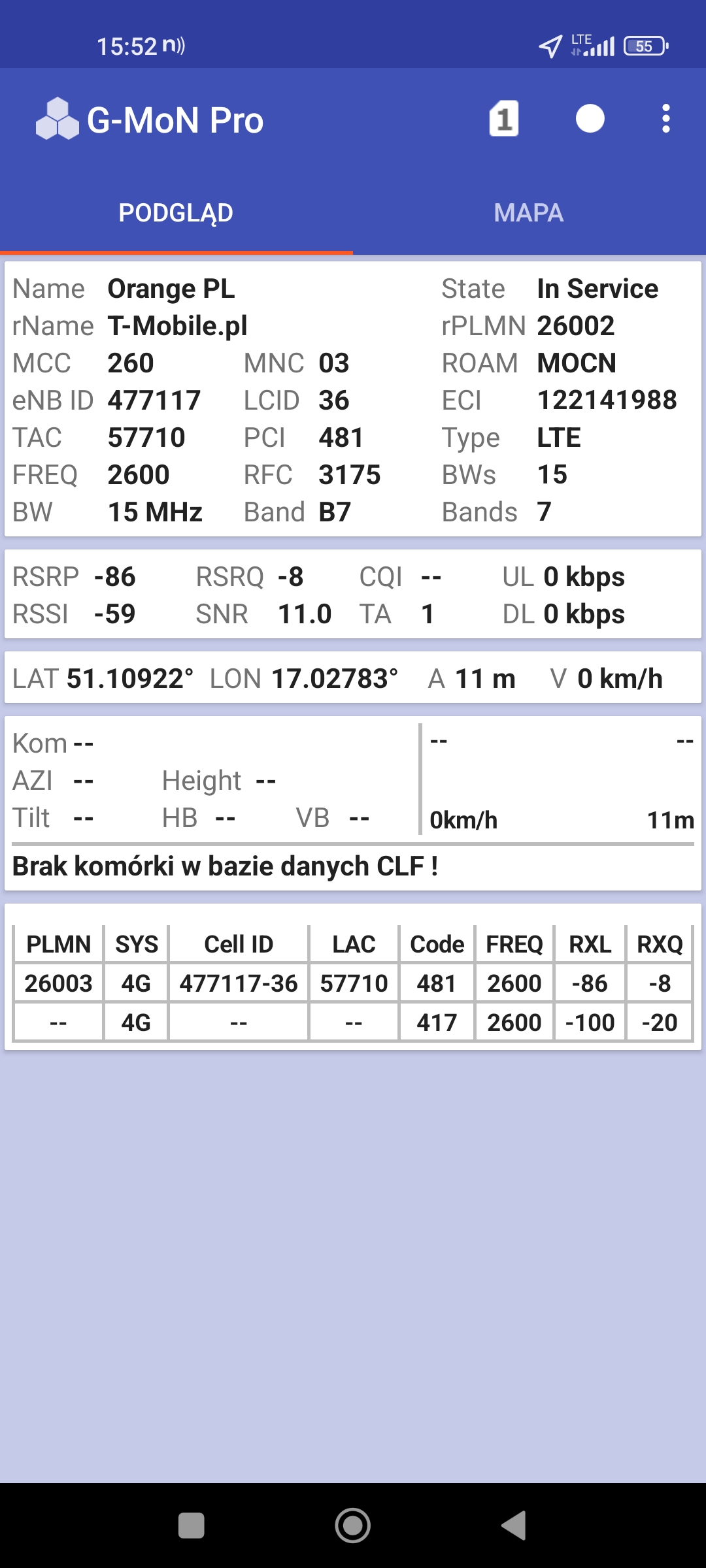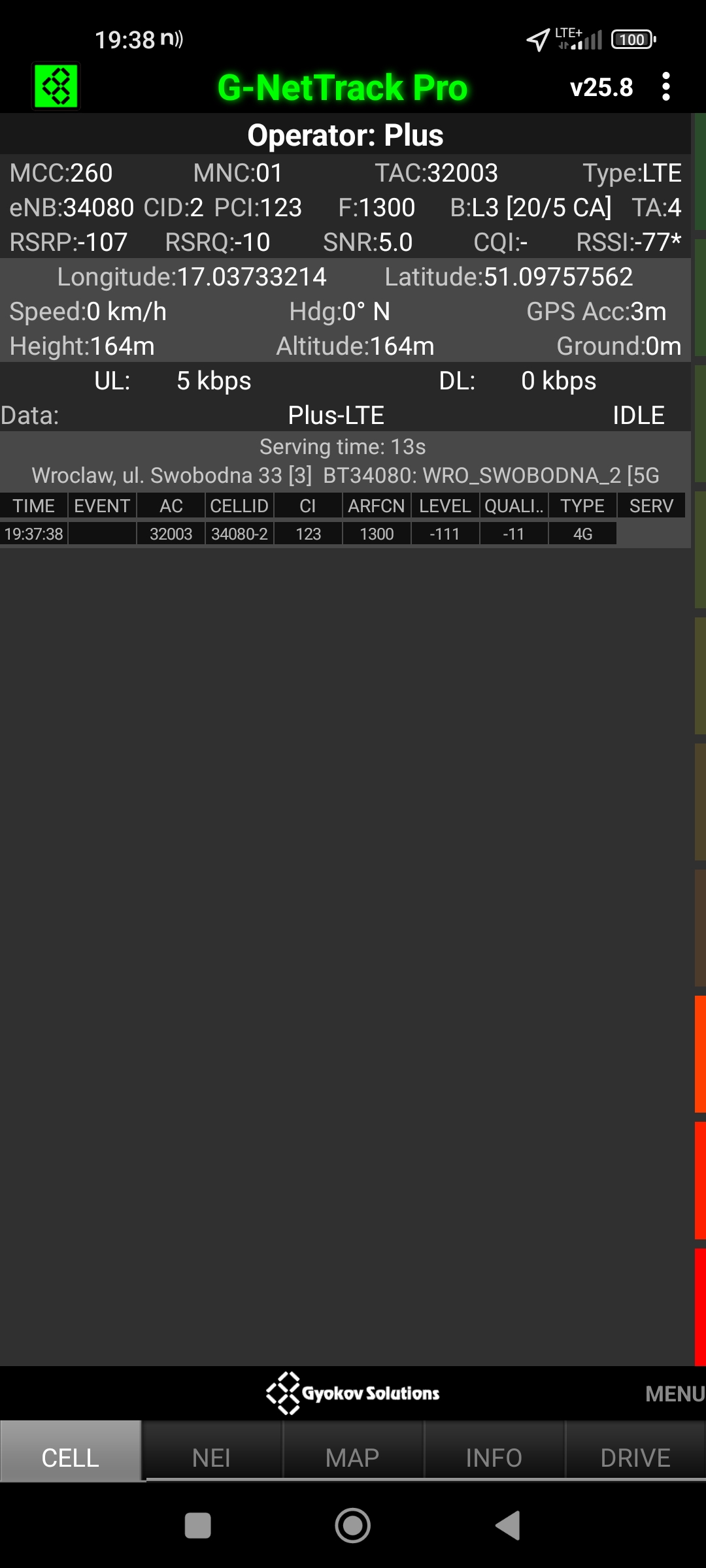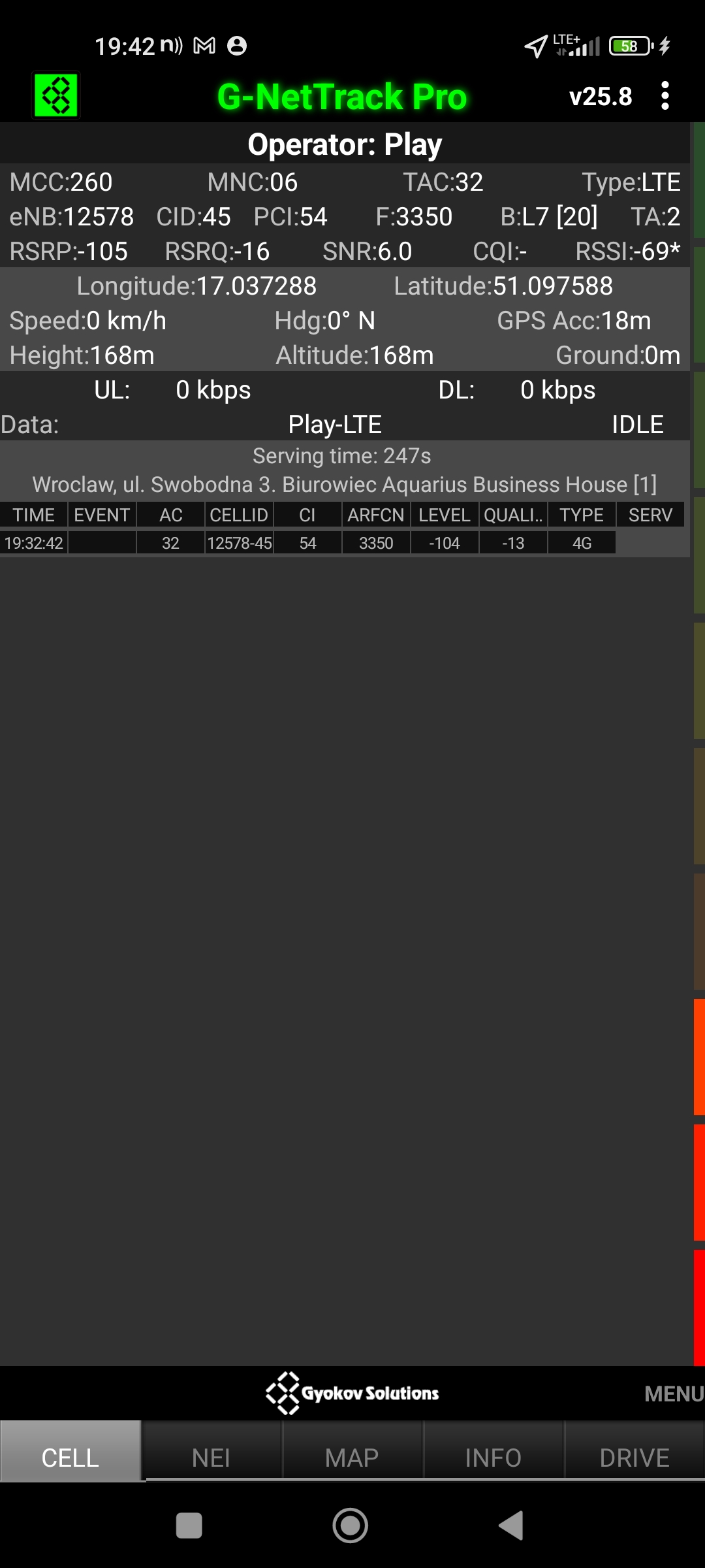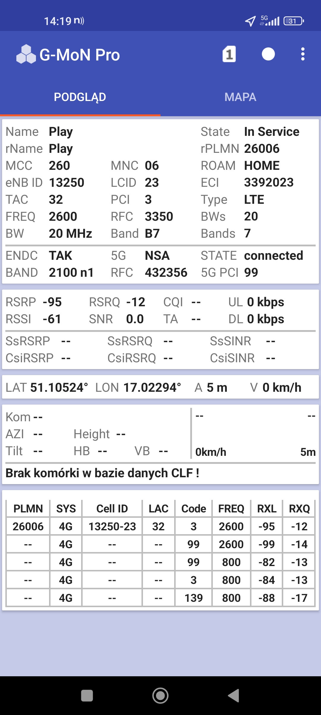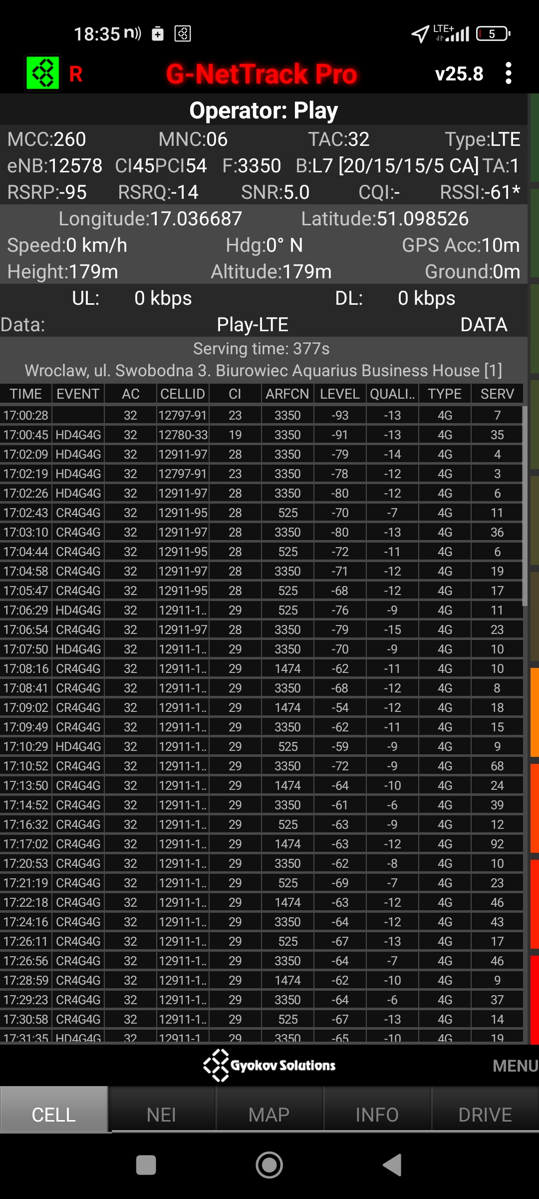 Jak widać na zaprezentowanych zrzutach ekranów, statystycznie najlepiej sprawowały się sieci operatorów globalnych. Przyjmując nawet mniejszą dostępność segmentu 5G, aniżeli u Plusa czy w Play – nie ma to znaczenia dla świadczonych dla klienta usług, ponieważ w momencie, kiedy operatorzy gwarantują zasięg LTE – gwarantują w zdecydowanej większości pożądaną jakość usług, konkurencyjną do segmentu 5G Plusa, który dla 5G posiada dedykowaną część pasma. Kuriozalną sytuację na dworcu Wrocław Główny wciąż posiada Plus. Operator dysponuje w stolicy Dolnego Śląska również stacjami, pracującymi z jednym pasmem LTE. Przeważnie jest to LTE1800. Jak wspominaliśmy na wstępie bieżącej informacji – prędkości, które dziś proponuje przy transmisji danych Play są niewspółmiernie niskie wobec tych, które były jeszcze kilka miesięcy temu. Ponieważ większość stacji jest wyposażona w komplet pasm, a stacji bazowych we Wrocławiu jest bardzo dużo – w tym miejscu kolejny raz można wrócić do piętrzących się od lat zaniedbań w jakości zarządzania siecią i w jej parametryzacji.