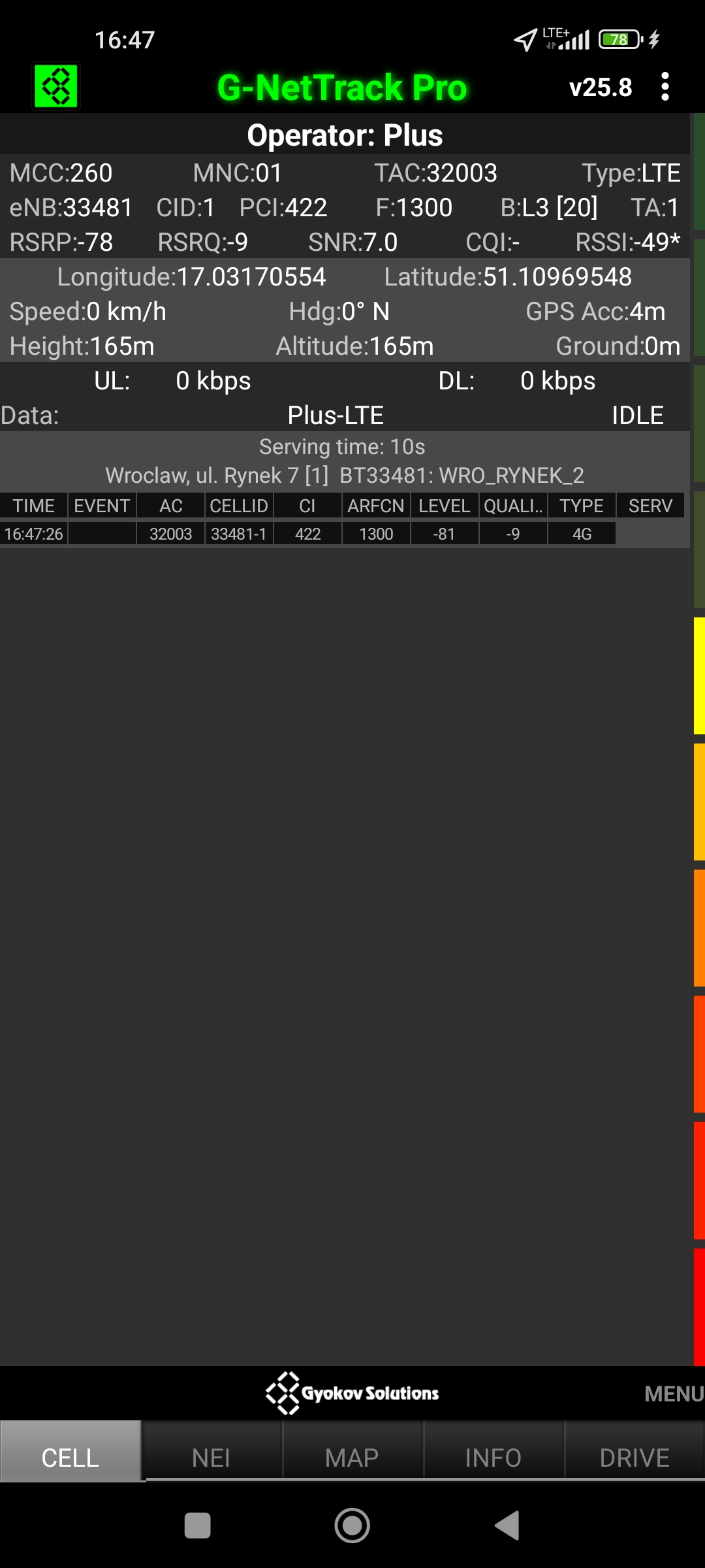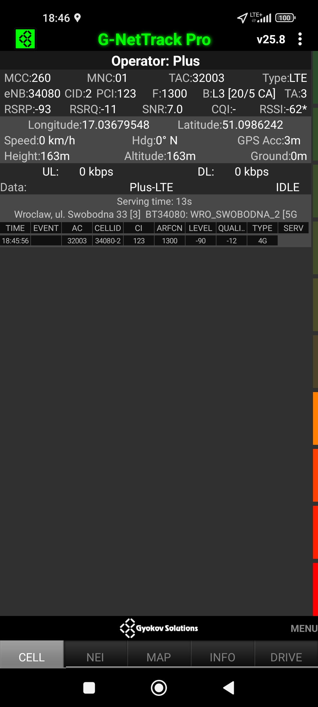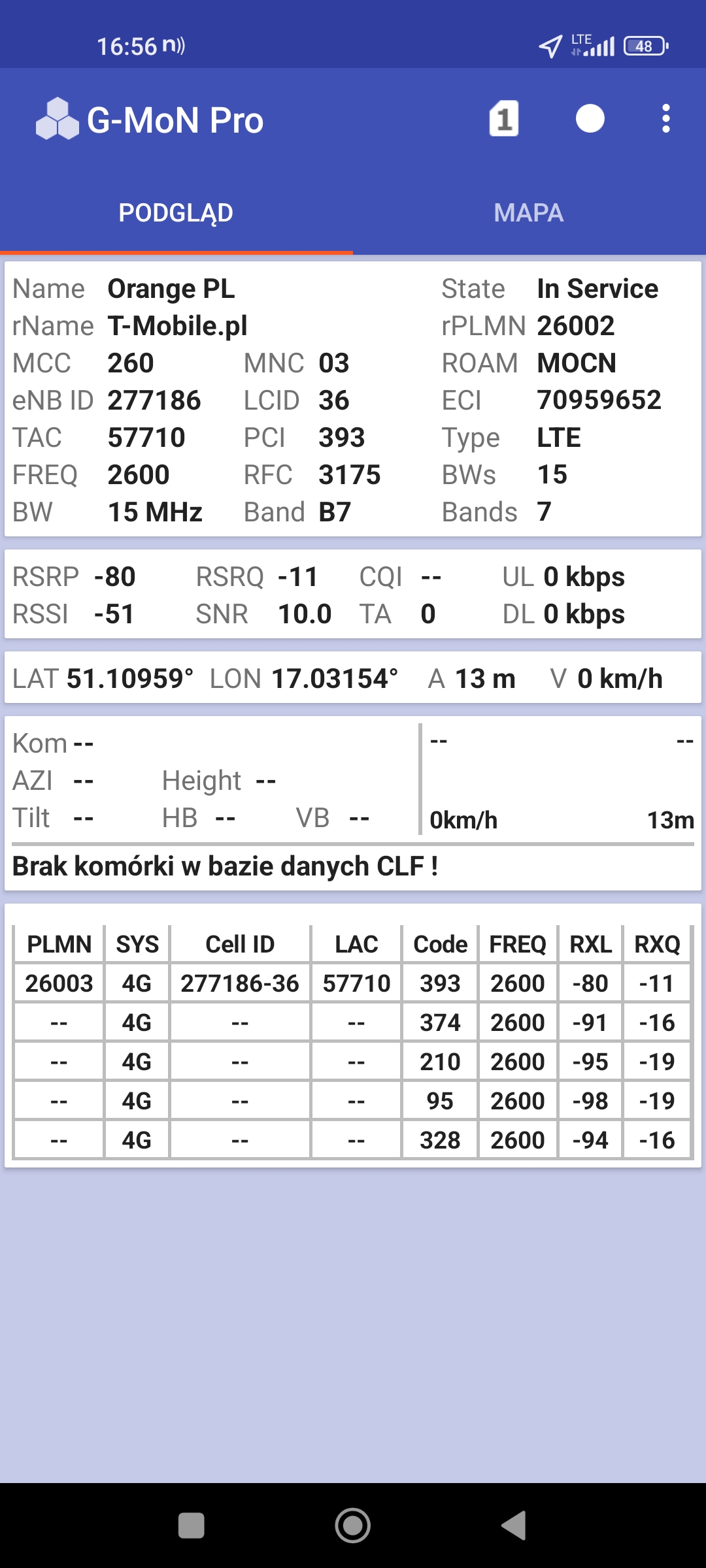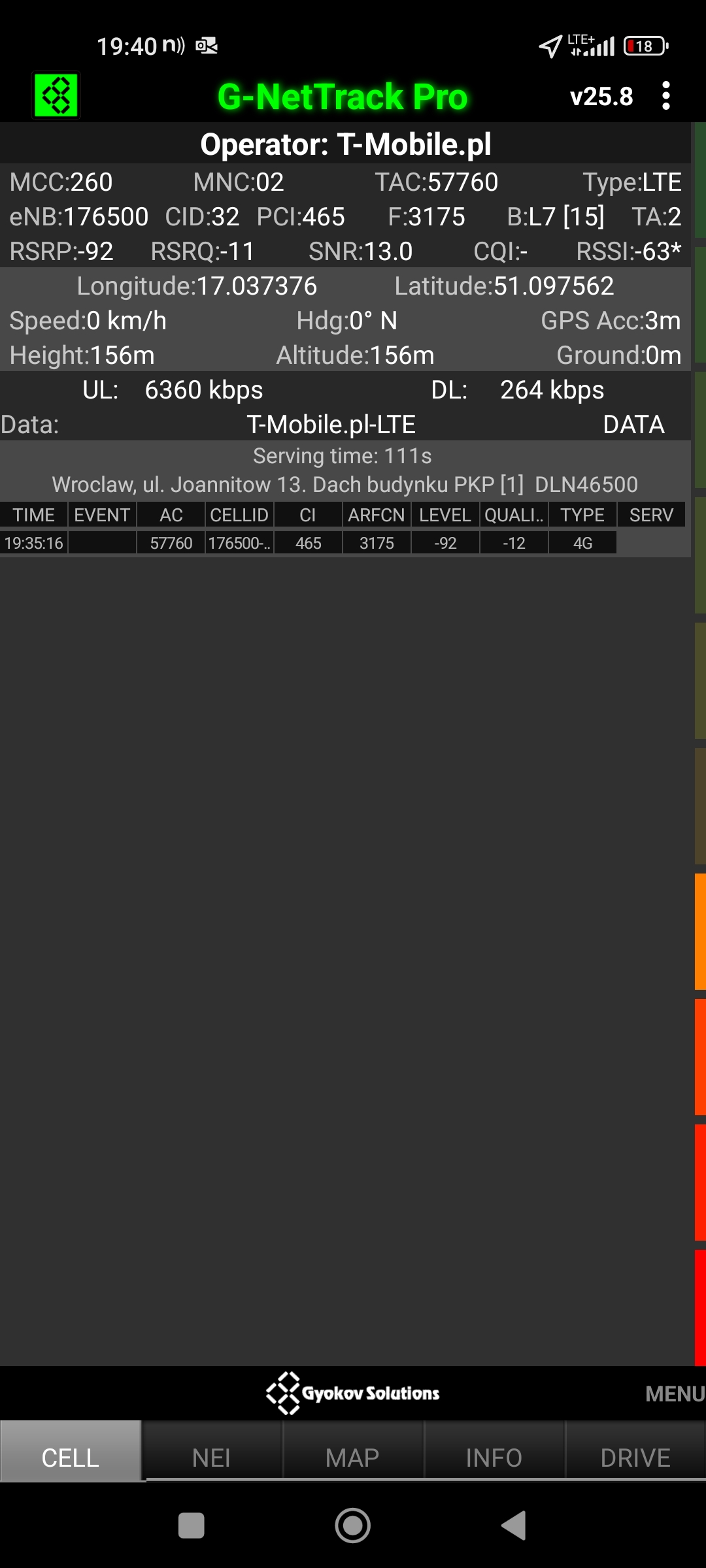 Jak widać na zaprezentowanych zrzutach ekranów, statystycznie najlepiej sprawowały się sieci operatorów globalnych. Przyjmując nawet mniejszą dostępność segmentu 5G, aniżeli u Plusa czy w Play – nie ma to znaczenia dla świadczonych dla klienta usług, ponieważ w momencie, kiedy operatorzy gwarantują zasięg LTE – gwarantują w zdecydowanej większości pożądaną jakość usług, konkurencyjną do segmentu 5G Plusa, który dla 5G posiada dedykowaną część pasma. Kuriozalną sytuację na dworcu Wrocław Główny wciąż posiada Plus. Operator dysponuje w stolicy Dolnego Śląska również stacjami, pracującymi z jednym pasmem LTE. Przeważnie jest to LTE1800. Jak wspominaliśmy na wstępie bieżącej informacji – prędkości, które dziś proponuje przy transmisji danych Play są niewspółmiernie niskie wobec tych, które były jeszcze kilka miesięcy temu. Ponieważ większość stacji jest wyposażona w komplet pasm, a stacji bazowych we Wrocławiu jest bardzo dużo – w tym miejscu kolejny raz można wrócić do piętrzących się od lat zaniedbań w jakości zarządzania siecią i w jej parametryzacji.