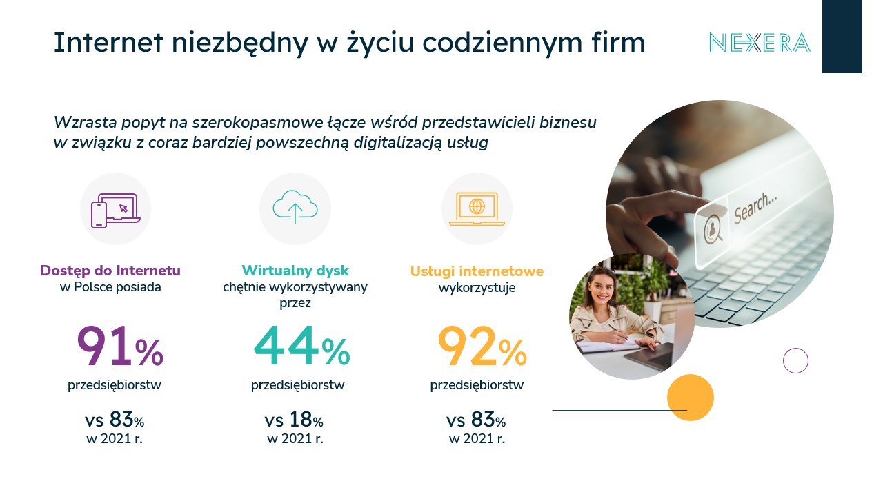 Popyt na szerokopasmowe łącze wśród przedstawicieli biznesu i coraz bardziej powszechna digitalizacja usług stanowi jeden z trendów wykazanych w badaniu przeprowadzonym przez Nexerę w Polsce. Według raportu #RegionyNEXERY2022 lokalne firmy zwiększyły zakres działań online w obszarze składania zamówień oraz kontaktów z klientami za pośrednictwem komunikatorów. Różnice wobec roku 2021 wynoszą w obu wypadkach 6 pkt. proc. W ciągu ostatniego roku więcej nowych użytkowników znalazły również serwisy chmurowe, a odsetek firm, deklarujących wykorzystywanie wirtualnego dysku, wzrósł z 18 proc. w 2021 r. do 44 proc. w 2022 r. Nieznaczny spadek widać jedynie w kategorii mediów społecznościowych, ale wynosi on tylko 3 pkt. proc. Warto też odnotować, że zmniejsza się liczba firm, które w ogóle nie korzystają z usług internetowych. Rok temu było ich 17 proc., a obecnie już tylko 8 proc. Nieco mniejszą dynamikę wzrostu zanotowano w tym roku w obszarze bankowości elektronicznej. W 2021 r. aż 29 proc. firm zwiększyło zakres działań w tym obszarze, podczas gdy w 2022 r. ta liczba to już tylko 20 proc.