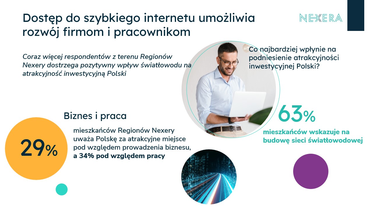 W trakcie pandemii Polacy nauczyli się pracować z domu. Coraz więcej osób preferuje też zdalną lub hybrydową formę pracy. Aby efektywnie prowadzić home office, potrzebujemy jednak dostępu do niezawodnego i szybkiego internetu. 55 proc. mieszkańców Polski wskazuje na możliwość pracy zdalnej jako kluczowe ułatwienie w codziennym życiu. Podobna sytuacja dotyczy firm, gdzie zacinająca się sieć może obniżyć produktywność pracowników. Jako firma budująca i rozwijająca infrastrukturę szerokopasmową na terenie Polski cieszymy się, że wielu mieszkańców dostrzega pozytywny wpływ światłowodu na atrakcyjność inwestycyjną naszego kraju. Dostęp do szybkiego internetu umożliwia pracownikom oraz firmom rozwój np. poprzez korzystanie ze szkoleń i kursów online podnoszących kompetencje. Prowadzenie aktywnej działalności w sieci może także przyciągnąć nowych klientów i inwestorów. Nasze badanie wykazało, że zapotrzebowanie na szybki i stabilny internet nigdy nie było większe, a powszechny dostęp do sieci światłowodowej bezpośrednio podnosi atrakcyjność miejsca zamieszkania, a także jakość życia i pracy zawodowej ‒ mówi Jacek Wiśniewski, prezes Nexery.