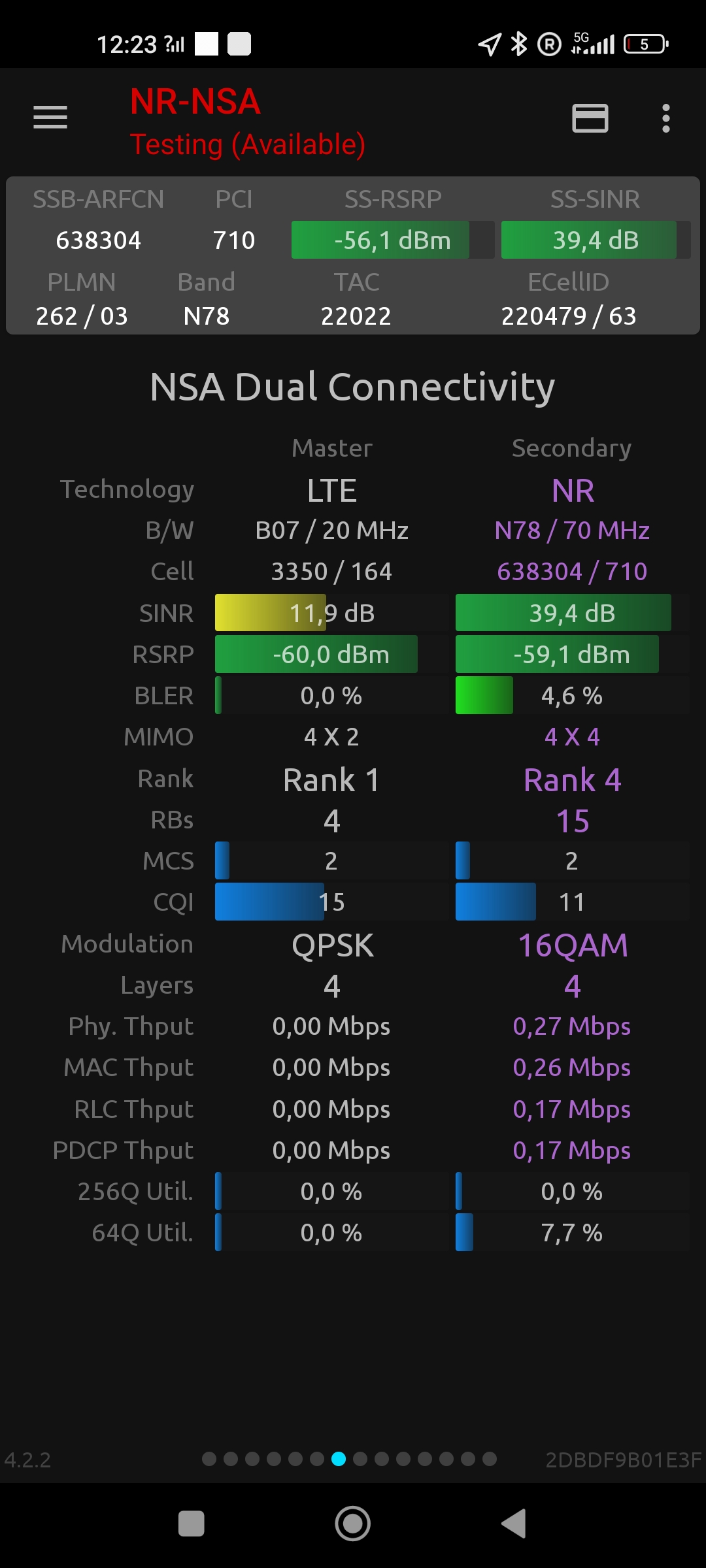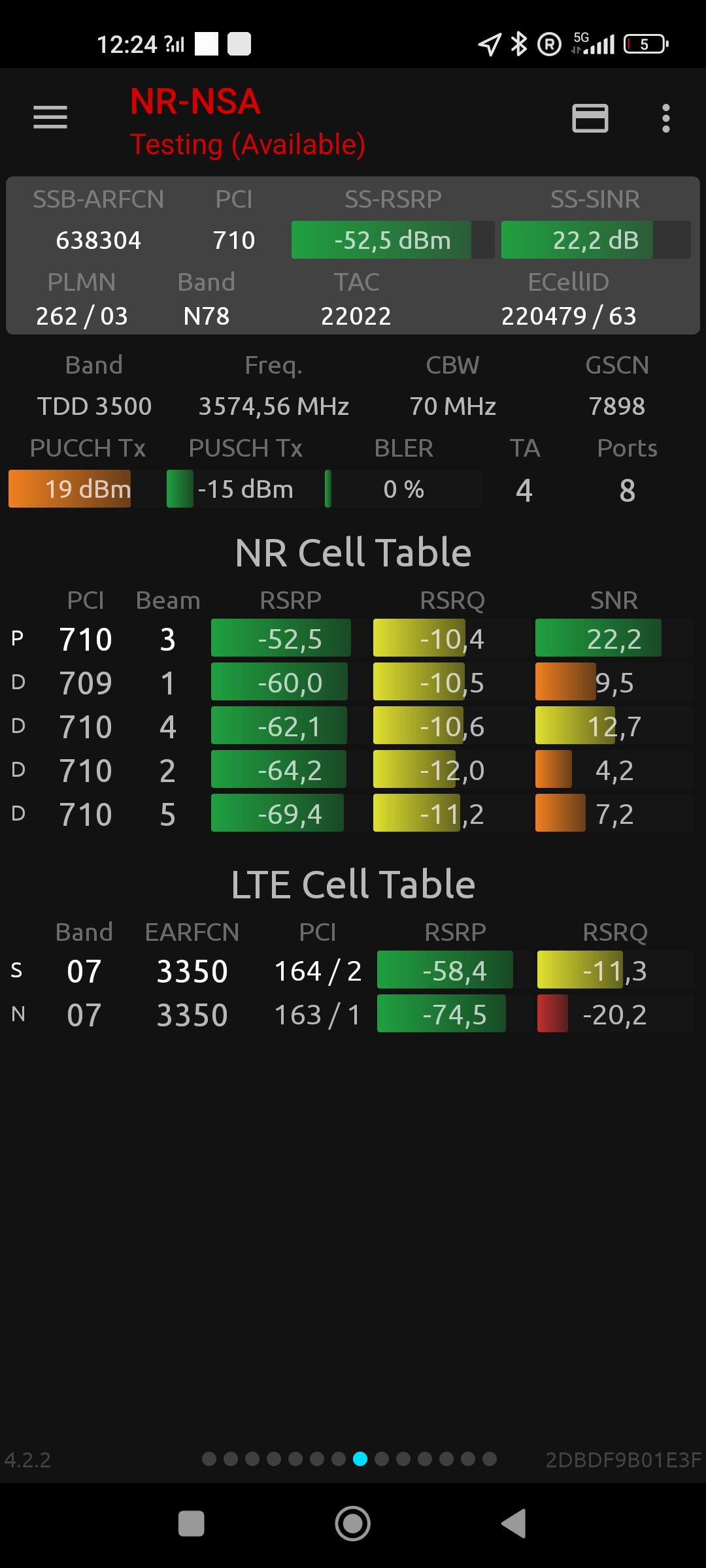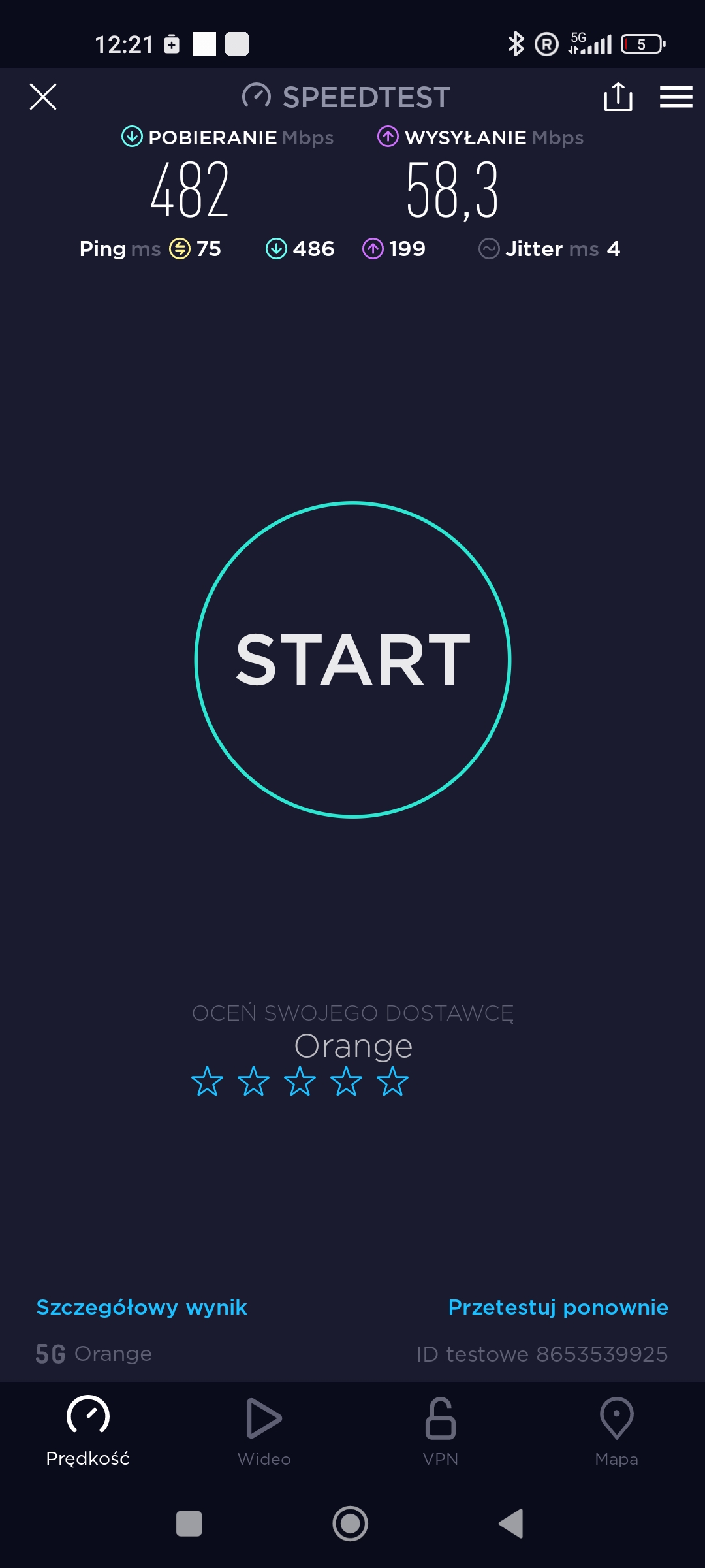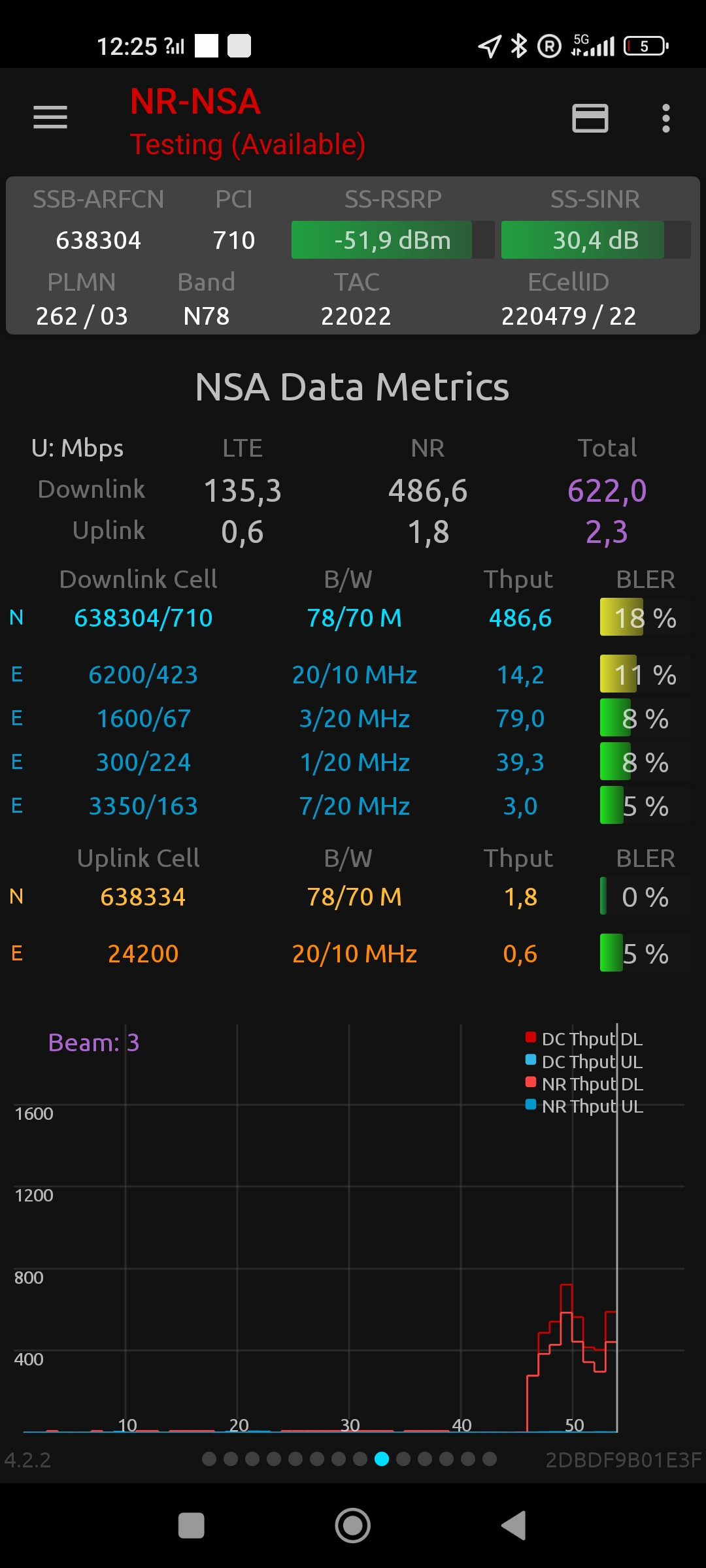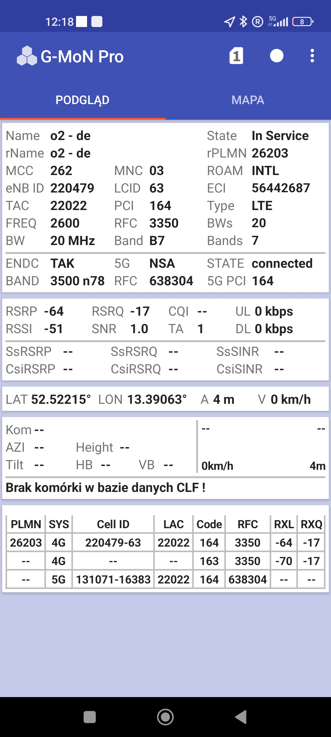 Podczas wizyty w Berlinie, przy okazji targów IFA2022 spojrzeliśmy na nasze aplikacje testowe w smartfonie. Telefon, oprócz odnalezienia sieci partnera roamingowego, odnalazł w nim aktywną technologię 5G. W stolicy Niemiec zorganizowano ją jako NSA, ale przy użyciu częstotliwości 3500MHz TDD, z szerokością pasma 70MHz, przy aktywnym współudziale częstotliwości LTE. Zaskoczyły nieco prędkości. Ponieważ w pobliżu stacji bazowej osiągaliśmy prędkości w speedtest od 199Mbps w dół do 597Mbps w dół. Więcej, aniżeli wymienione 597Mbps nie udało się uzyskać. Warto jednak wspomnieć, że Berlin to stolica istotnego, europejskiego państwa, gdzie ruch sieciowy jest również niewspółmierny względem tzw. statystycznego. Test, który prezentujemy poniżej zrealizowano w centrum Berlina, w sąsiedztwie rzeki Sprewa. Współrzędne można odnaleźć na danych aplikacji testowych, a na zamieszczonej mapie zorientować się co do punktu pobytu. Dodajmy, że instalacje antenowe pasma 3500MHz, to adekwatne do długości fali krótkie anteny, zainstalowane obok „tradycyjnych”, obsługujących ruch LTE. Poza Berlinem sieć 5G jest również zorganizowana jako NSA, ale na bazie częstotliwości 2100MHz w trybie DSS. Prędkości są porównywalne z prędkościami LTE, w zależności od obciążenia stacji. Taka sieć 5G pracuje na przykład w Poczdamie.