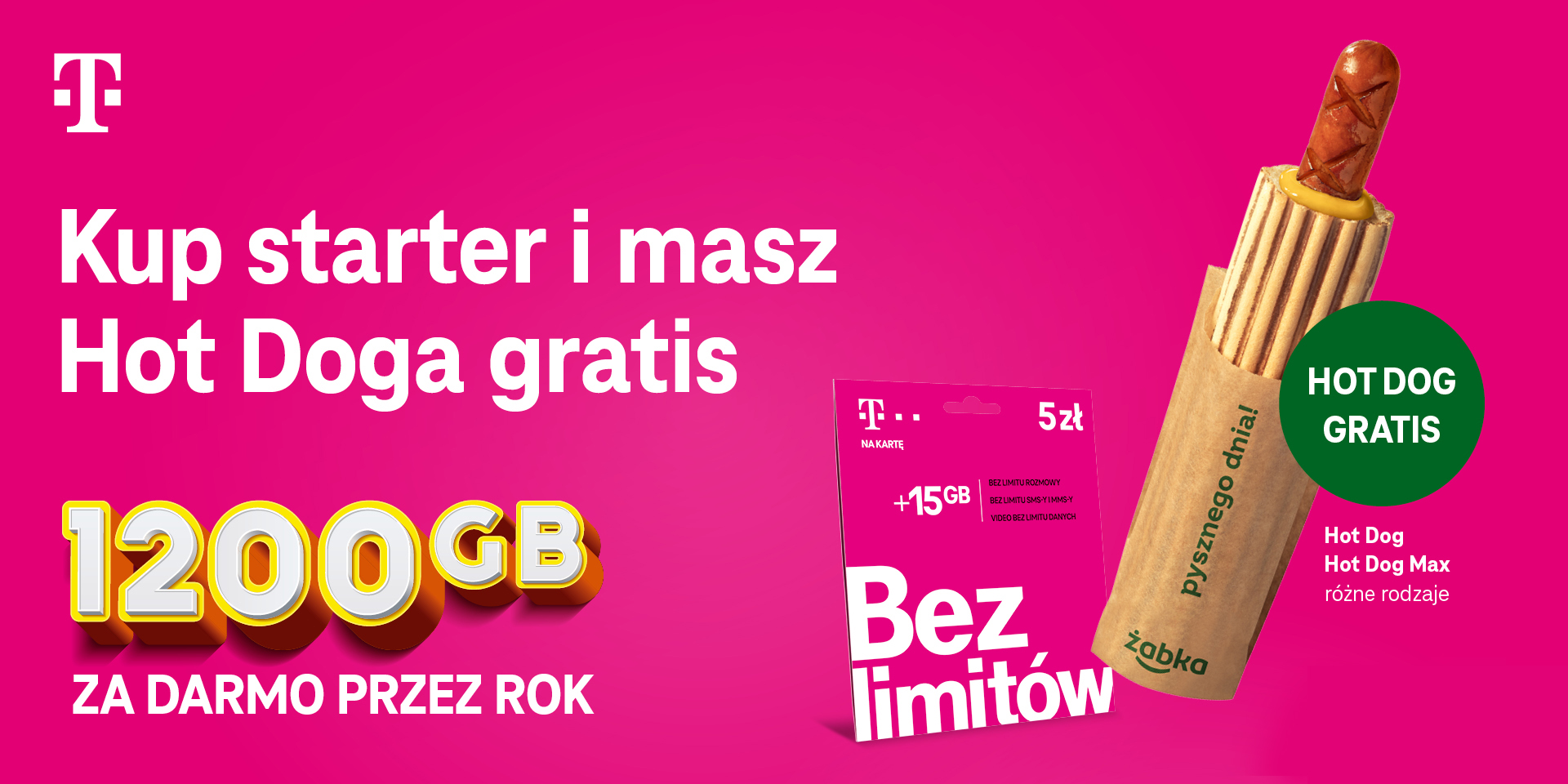 Kup starter T-Mobile na kartę w sklepie Żabka, a solidną porcję 1200 GB oraz hot-doga otrzymasz w prezencie. Zbyt małe porcje bywają rozczarowujące – zwłaszcza gdy dotyczą rozmiarów pakietu internetu. Dlatego w T-Mobile, wraz z siecią sklepów Żabka, przygotowaliśmy sycącą promocję dla tych, którzy mają apetyt na więcej – nie tylko jeśli chodzi o gigabajty. Od 7 września osoby, które kupią dowolny starter T-Mobile na kartę w jednym ze sklepów sieci Żabka, otrzymają bon uprawniający do odbioru hot-doga w prezencie. Dodatkowo zaś starter pozwoli im na skorzystanie z oferty z 1200 bonusowymi GB przez 365 dni.
