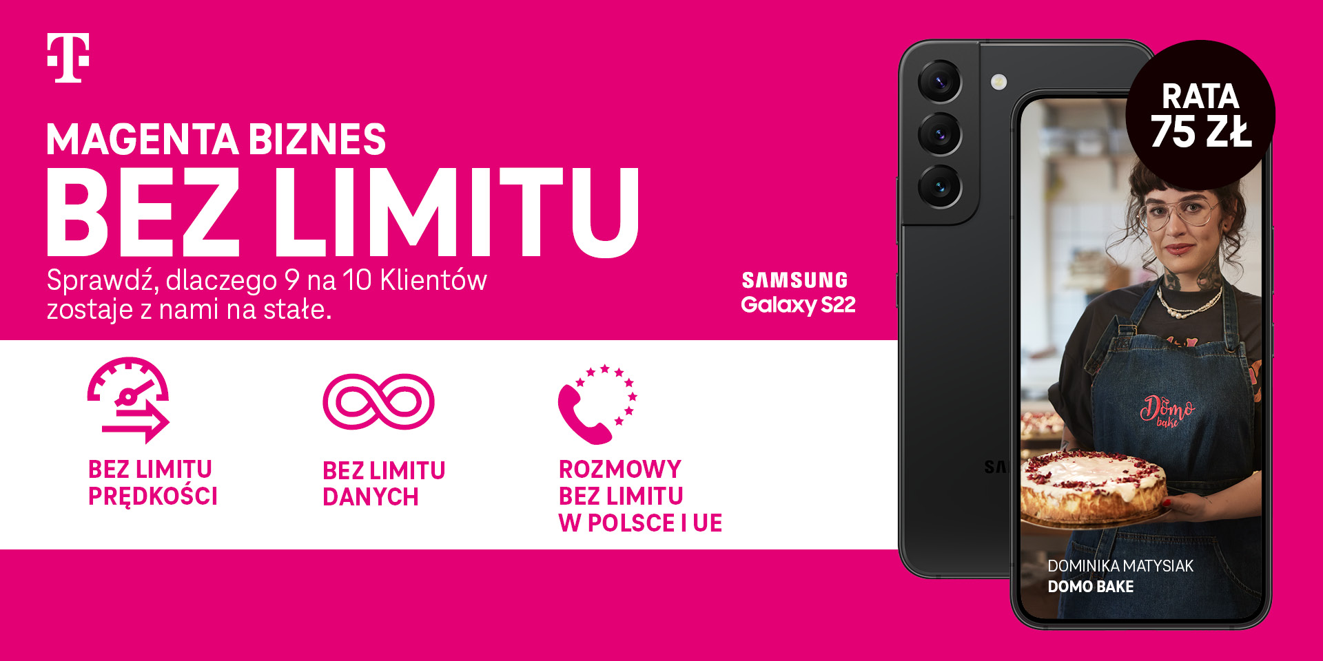MagentaBIZNES bez limitów – startuje nowa kampania T-Mobile z ofertą dla firm. Prowadzenie biznesu we współczesnym świecie wiąże się z wieloma wyzwaniami. Przedsiębiorcy potrzebują usług, które pozwolą im rozwijać się i bez ograniczeń realizować wyznaczone cele. W T-Mobile wiemy, jak istotny jest szybki i swobodny przepływ i dostęp do informacji, dlatego w ramach oferty MagentaBIZNES oferujemy im internet bez limitu danych i prędkości oraz nielimitowane rozmowy. Tym razem użytkownicy, którzy zdecydują się na tę usługę, będą mogli nabyć smartfon Samsung Galaxy S22 w bardzo korzystnej cenie z ratą 75 zł miesięcznie. Co jest kluczem do sukcesu w prowadzeniu własnej działalności? Zapewne wiele czynników ma na to wpływ, ale niewątpliwie jednym z nich są zaufani partnerzy. A takim partnerem chcemy być dla naszych klientów biznesowych w ich codziennych zadaniach. Dzięki ofercie MagentaBIZNES mają więc oni dostęp do internetu bez limitu prędkości i bez limitu danych oraz nielimitowanych rozmów na terenie Polski i Unii Europejskiej. I jak pokazują nasze dane, doceniają oni ten komfort, bo aż 9 na 10 z nich zostaje z nami na stałe.