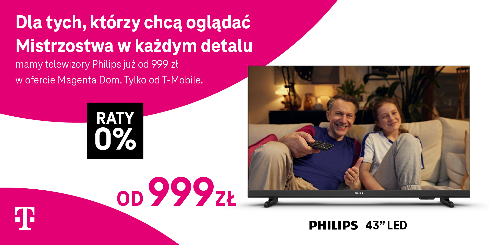W listopadzie startują Mistrzostwa Świata w Piłce Nożnej, które w tym roku będą wyjątkowe – pierwszy raz bowiem gospodarzem mundialu będzie Katar, więc ze względu na panujące tam wysokie temperatury, mecze zostały przełożone na jesień. Dla wszystkich fanów piłki nożnej będą to dni, a nawet tygodnie, pełne sportowych wrażeń. Dlatego też – aby klienci mogli jeszcze lepiej cieszyć się rozgrywkami na światowym poziomie, w T-Mobile przygotowaliśmy specjalną promocję na telewizory w pakiecie Magenta Dom z abonamentem komórkowym w taryfie „L Nielimitowana”. Wśród dostępnych urządzeń jest m.in. Philips 43” LED, który można kupić już za 999 zł . W ofercie dostępne są również telewizory 55” i 65” zarówno tego, jak i innych producentów. Wszystkie urządzenia można kupić w opcji ratalnej 0%, w umowie na 24 miesiące.