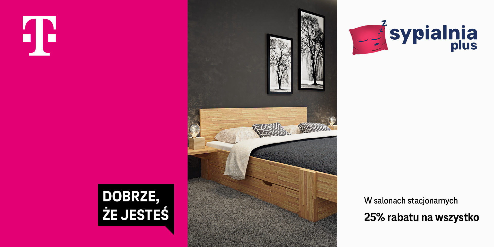 Odbierz 25% rabatu od T-Mobile na produkty w sklepach stacjonarnych SypialniaPlus. Przytulny azyl, strefa regeneracji, królestwo snu. Dla wielu najważniejsze pomieszczenie w domu. Mowa o… sypialni! Szczególnie jesienną porą lubimy tutaj spędzać najwięcej czasu. Na łóżku pośród poduszek lub w wygodnym fotelu otulamy się ciepłym kocem, by zanurzyć się w świecie ulubionych bohaterów – książkowych albo serialowych. Aby ten moment był jeszcze bardziej komfortowy, przygotowaliśmy dla klientów indywidualnych T-Mobile 25% rabatu na wszystkie produkty dostępne w sklepach stacjonarnych SypialniaPlus.