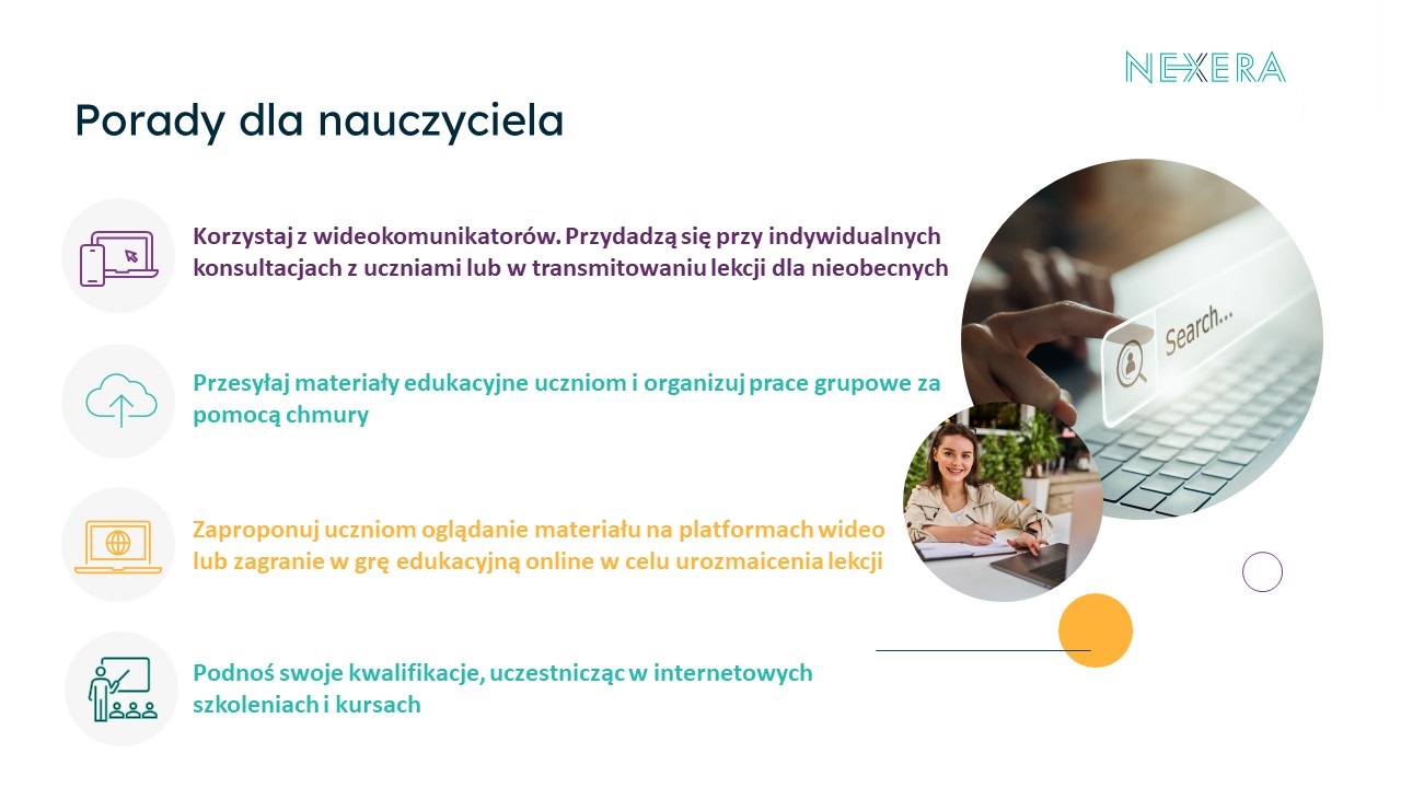 – Korzystaj z wideokomunikatorów. Przydadzą się przy indywidualnych konsultacjach z uczniami lub w transmitowaniu lekcji dla nieobecnych.