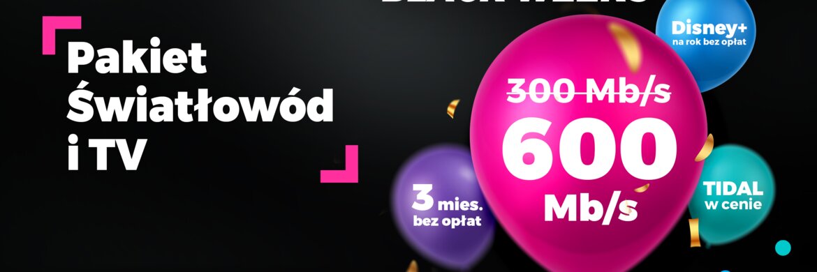W tegorocznej edycji „Black Weeks” w Netii szybsze opcje światłowodu (do 600 Mb/s i do 1 Gb/s) i pakiety z TV w jakości 4K są w okresie zobowiązania 10 zł miesięcznie tańsze. Kolejne benefity to 3 miesiące abonamentu gratis oraz TIDAL i Disney+ nawet przez 2 lata bez opłat. W ramach najnowszej promocji „Black Weeks”, którą Netia przygotowała z okazji zbliżającego się Czarnego Piątku (Black Friday), można skorzystać z atrakcyjnych cen szybszych opcji dostępu do internetu w technologiach światłowodowych oraz pakietów z TV w jakości 4K. Wybierając dowolny z poniżej prezentowanych wariantów – w porównaniu ze standardową ofertą promocyjną – klienci oszczędzą w okresie trwania zobowiązania 10 zł miesięcznie.