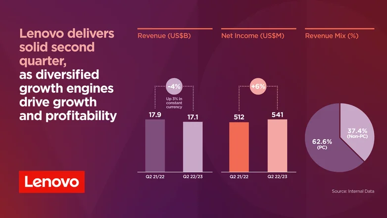 Lenovo odnotowuje dziesiąty z rzędu kwartał lepszą rentowność w ujęciu rok do roku, dzięki odporności operacyjnej i zróżnicowanym motorom wzrostu, które nadal napędzają wyniki. 3 listopada 2022 – Grupa Lenovo (HKSE: 992) (ADR: LNVGY) ogłosiła dziś wyniki drugiego kwartału, przy czym rentowność poprawiła się rok do roku dziesiąty kwartał z rzędu. Zysk netto w drugim kwartale wzrósł o 6% rok do roku do 541 mln USD, a przychody Grupy wzrosły do 17,1 mld USD, co oznacza wzrost o 3% rok do roku w stałej walucie. Wszystkie główne obszary działalności przyniosły dodatni zysk operacyjny, co świadczy o dalszych postępach w realizacji celu Grupy, jakim jest podwojenie rentowności w perspektywie średnioterminowej. Ponadto, zdywersyfikowane motory wzrostu nadal przyczyniają się do osiągania dobrych wyników – zarówno w obszarze rozwiązań i usług, jak i infrastruktury odnotowano wysoki, dwucyfrowy wzrost rok do roku. Firmy spoza branży komputerów osobistych stanowią obecnie ponad 37% całkowitych przychodów grupy. Zdrowy bilans gotówkowy Grupy oznacza, że jest ona nadal zaangażowana w podwajanie inwestycji w badania i rozwój (R&D) w perspektywie średnioterminowej, zwiększając wydatki na badania i rozwój o 15% rok do roku w omawianym kwartale. Podczas gdy obecne wyzwania zewnętrzne utrzymują się, Lenovo pozostaje skoncentrowane na realizacji swojej strategii oraz zapewnieniu bieżącej rentowności poprzez zrównoważenie zasobów w kierunku swoich zróżnicowanych motorów wzrostu oraz zwiększaniu efektywności i ograniczaniu kosztów w ramach działalności. Grupa dostrzega długoterminowe możliwości zbudowane na fundamencie New IT – klient, krawędź, chmura, sieć i inteligencja – zgodnie z globalnymi trendami związanymi z cyfryzacją i inteligentną transformacją, które nabierają coraz większego tempa. Wyniki z ostatniego kwartału, a także z ostatnich trzech lat, pokazały, że połączenie strategii Lenovo, jej konsekwentna realizacja oraz prężne działanie Grupy umożliwia przejście przez cykl branżowy. To, w połączeniu z wysokiej jakości innowacyjnym portfolio, unikalnym hybrydowym łańcuchem produkcyjnym i dostawczym, zasadą i możliwościami globalnymi/lokalnymi, a także zdrową płynnością finansową, pomoże stworzyć dalsze możliwości zapewnienia zrównoważonego wzrostu i poprawy rentowności.