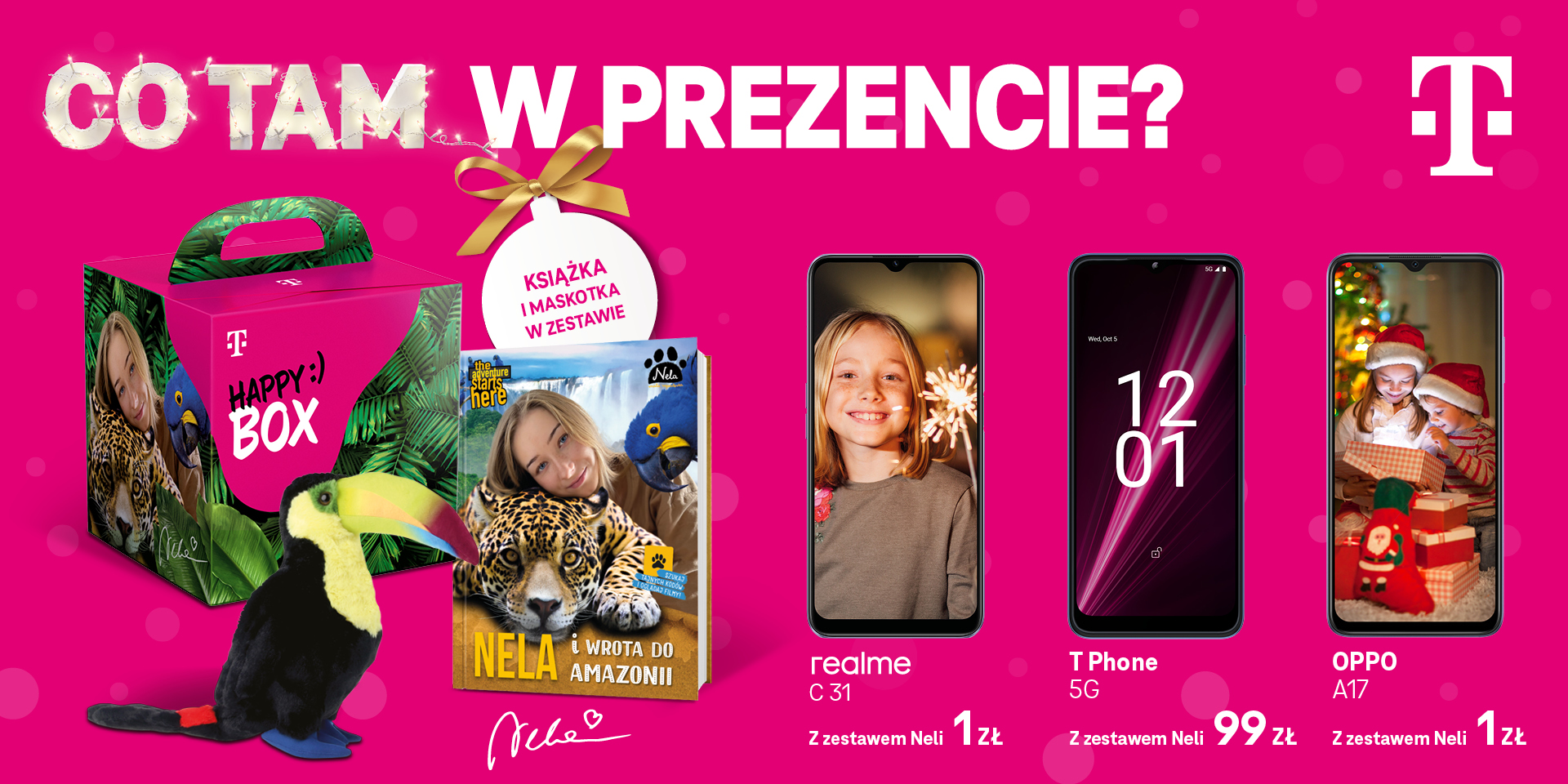 Wybierz swój Happy BOX ze smartfonem i książką Neli Małej Reporterki od T-Mobile. Sezon świąteczny w T-Mobile już oficjalnie rozpoczęliśmy, ale to nie koniec prezentów, które przygotowaliśmy dla naszych klientów. Dziś prezentujemy trzy świąteczne zestawy Happy BOX dostępne w ofercie MIX, które z pewnością ucieszą i wprowadzą w podróżniczy świat najmłodszych członków rodzin. W ofercie mamy bowiem wybrane smartfony realme, OPPO i T Phone 5G wraz z najnowszą książką o Amazonii, autorstwa Neli Małej Reporterki, i pluszowym tukanem z edycji limitowanej. Święta to wyjątkowy czas, który zazwyczaj spędzamy w rodzinnym gronie, by jeszcze bardziej nacieszyć się swoją bliskością. Na ten okres w roku szczególnie czekają najmłodsi, wypatrując Mikołaja z workiem pełnym prezentów. Z myślą o nich przygotowaliśmy trzy gwiazdkowe zestawy Happy BOX-ów, które sprawią, że te święta z pewnością będą jeszcze przyjemniejsze i pozwolą im być w kontakcie z najbliższymi. Tegoroczne Happy BOX-y przeniosą obdarowane nimi osoby w fantastyczne – wręcz magiczne – miejsce, bowiem poza nowoczesnymi smartfonami, w każdym z nich znajdzie się najnowsza książka Neli Małej Reporterki, przedstawiająca jej podróż do Amazonii oraz maskotka tukana tęczowego z limitowanej edycji. A co dokładnie na nich czeka? Tym razem czytelnicy razem z Nelą pojadą w niezwykłą podróż przez Argentynę, aż do Brazylii w stronę wrót do Amazonii. Będą obserwować słonie morskie, zanurkują z uchatkami oraz poznają fantastycznych mieszkańców lasu deszczowego. Dzięki kolejnej wyprawie Neli dzieci mogą odkrywać świat w sposób najbardziej przystępny, a zarazem ciekawy dla najmłodszych. W książce umieszczono specjalne kody QR, poprzez które czytelnicy mogą obejrzeć prawdziwe filmy z wypraw oraz zwierzęta z drugiego kontynentu.