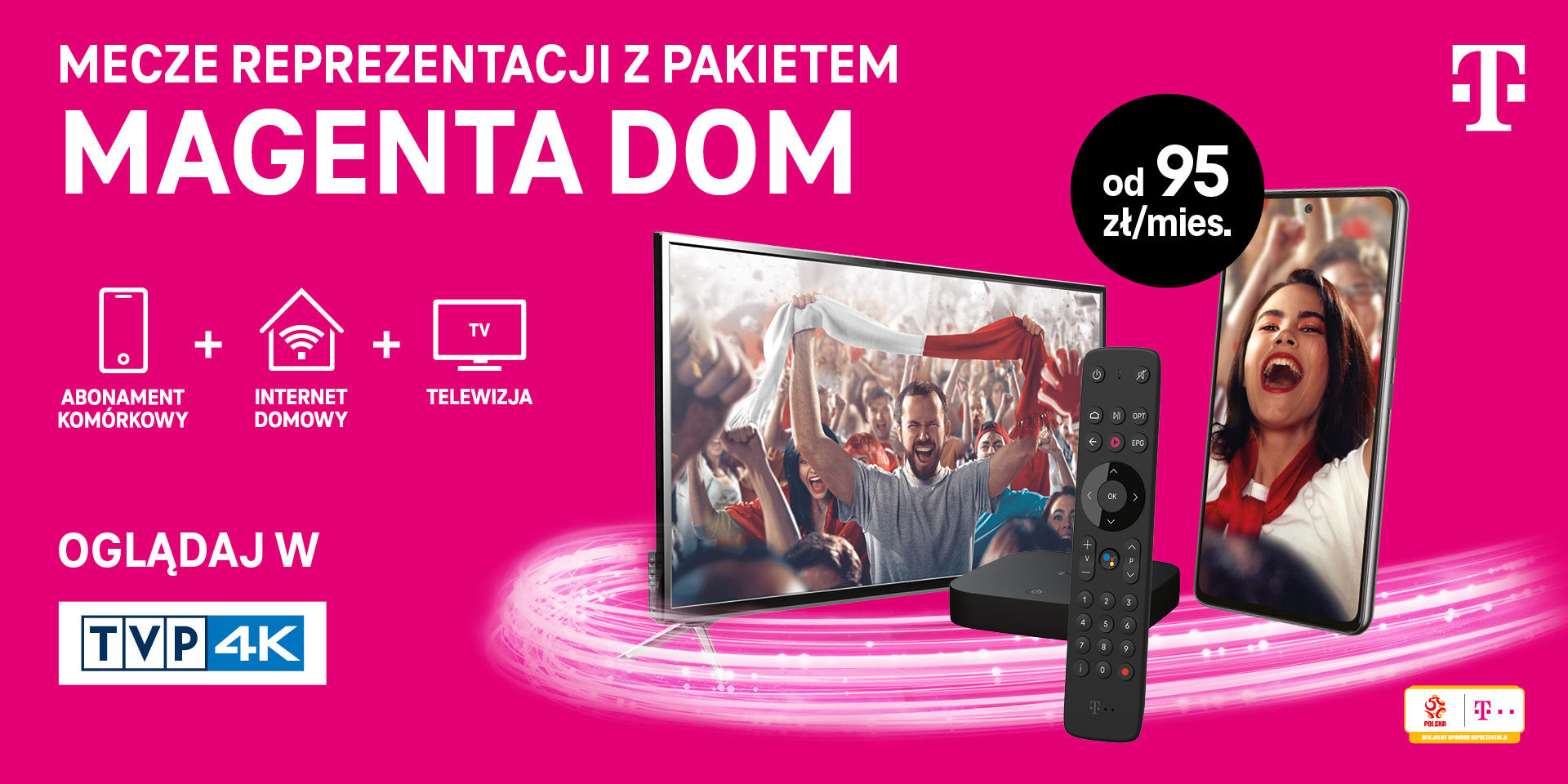 T-Mobile poprzez pakiet usługi konwergentnej Magenta DOM (usługi głosowe, internet i telewizja) dostarcza do domów swoich klientów najlepszą rozrywkę i emocje. W ofercie nie mogło więc zabraknąć piłki nożnej na najwyższym poziomie. Mecze w 4K, bez dodatkowych opłat, będą mogli oglądać zarówno obecni, jaki nowi abonenci. Szczegóły oferty Magenta Dom są dostępne na stronie:
