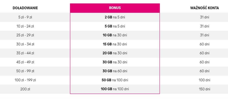 Aby zgarnąć bonus, należy doładować konto kwotą min. 5 zł. Przy czym im wyższą sumą zasilimy numer, tym więcej dodatkowych GB otrzymamy. Podwojeniu podlega suma tych GB, które dostajemy w ramach oferty promocyjnej „GB po doładowaniu” lub „Gigabajty od Heyah” . I tak – w T-Mobile na kartę, zasilając konto kwotą 5-9 zł, możemy liczyć na 4 bonusowe gigabajty (2 GB w ramach promocji „GB po doładowaniu oraz 2 GB w promocji Black Friday). Jeżeli na doładowanie wydamy 25-29 zł, suma GB wyniesie odpowiednio 20 GB (10 + 10 GB). Z kolei przy wyborze kwoty zasilenia 35-44 zł otrzymamy promocyjne 40 GB (20 + 20 GB).