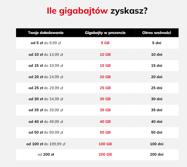 Z promocji można skorzystać wielokrotnie. Liczbę przyznanych GB oraz czas ich ważności potwierdzi wiadomość SMS, którą użytkownik otrzyma po zasileniu konta. Więcej informacji na temat akcji promocyjnej można znaleźć na stronie: