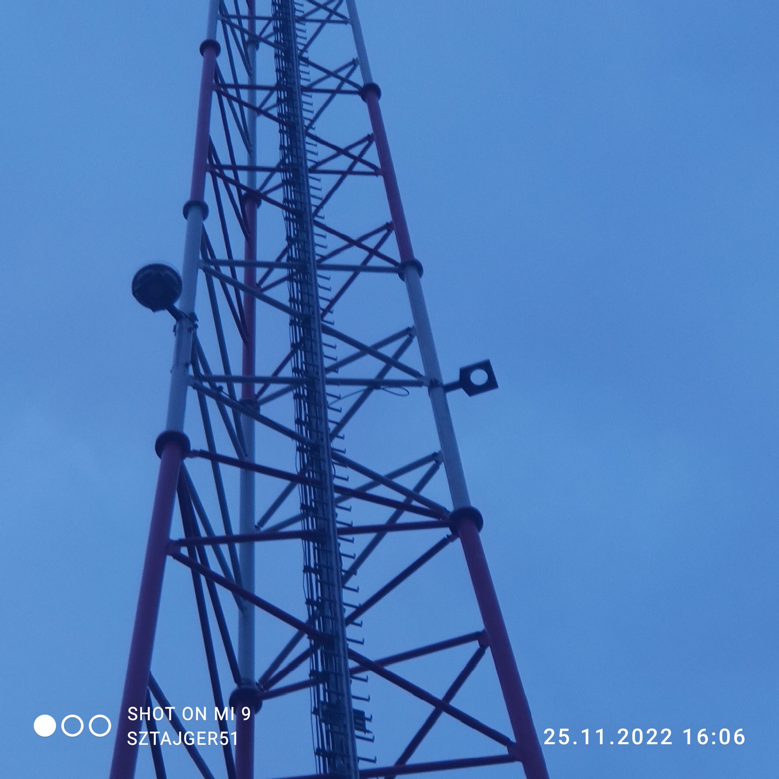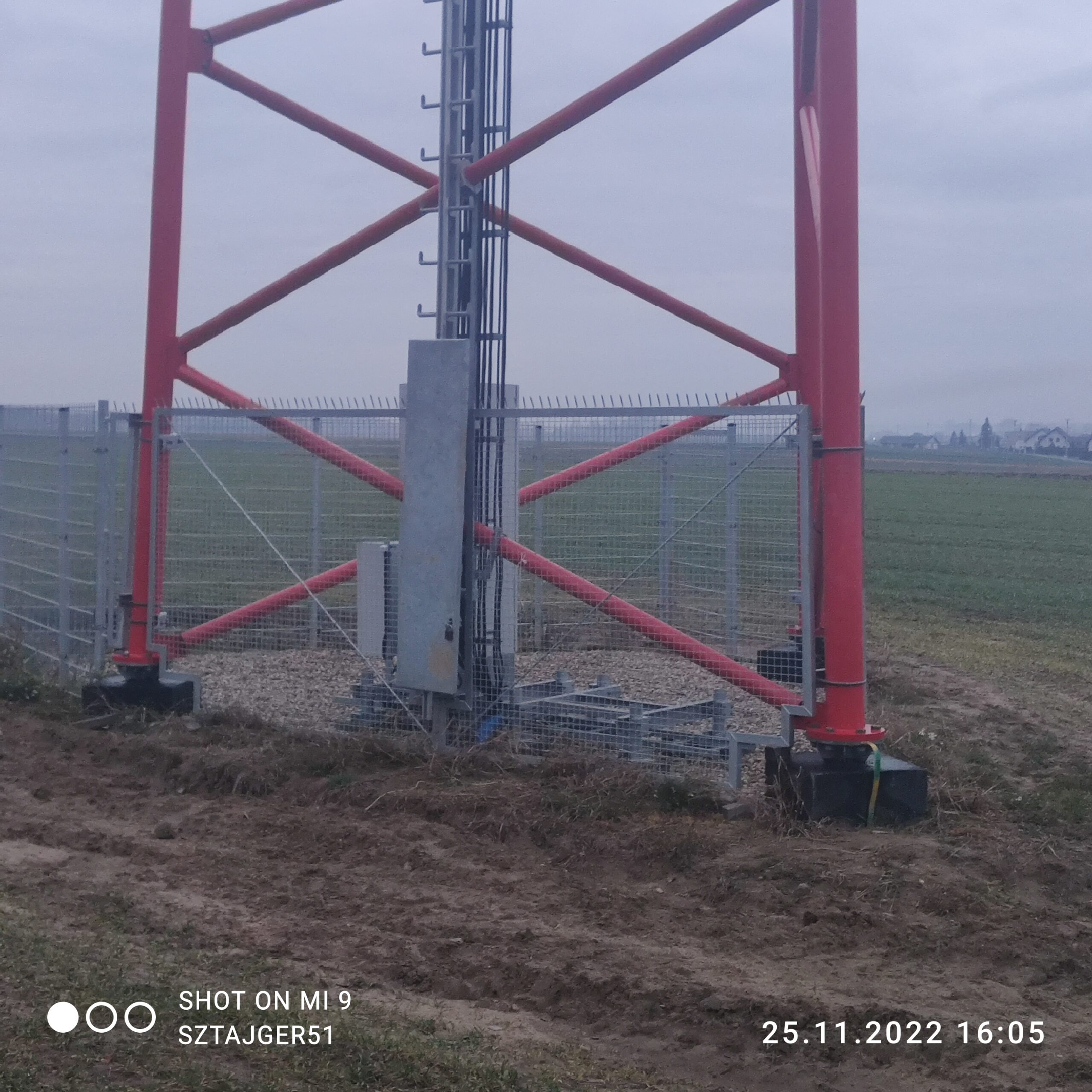 b) jedna z lamp diodowych oświetlenia przeszkodowego nie podłączona (po prawej stronie wieży, przewód doprowadzony, ale lampy brak)