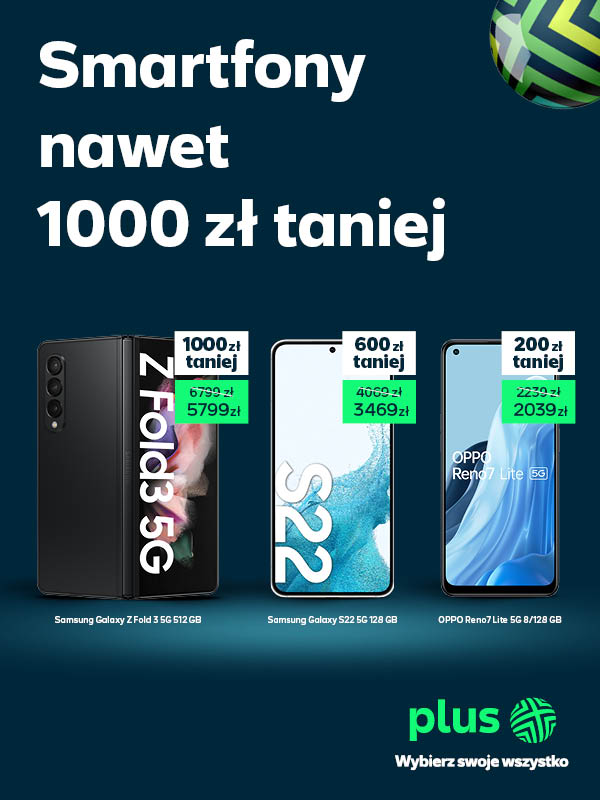 Na szczególną uwagę zasługują trzy modele marki Samsung obsługujące najszybszą w rankingu SpeedTest.pl sieć 5G Plusa. Pierwszy z nich, Samsung Galaxy S22 5G w dwóch wersjach pamięciowych do wyboru – 128 GB lub 256 GB. Model ten charakteryzuje się świetnym zestawem aparatów, które pozwalają wykonać odpowiednio doświetlone, wyraźne i pełne kolorów zdjęcia i filmy, nawet nocą. Samsung Galaxy S22 wyposażony jest w wyświetlacz Dynamic AMOLED 2X, który ułatwia użytkowanie smartfona na zewnątrz, także w słoneczny dzień. Za szybkie działanie i brak opóźnień odpowiada procesor wykonany w technologii 4 nm. Natomiast, odświeżanie ekranu z wysoką częstotliwością do 120 Hz gwarantuje płynne wyświetlanie grafik. W ramach wyprzedaży w Plusie, cena obu wersji smartfona Samsung Galaxy S22 5G została obniżona o 600 złotych. Samsung Galaxy S22 5G 128 GB jest dostępny za 349 zł na start oraz 12 rat po 259,99 zł. Samsung Galaxy S22 5G 256 GB dostępny jest za 349 zł na start oraz 12 rat po 274,99 zł. Kolejnym polecanym smartfonem jest Samsung Galaxy A23 5G 4/64GB. Model łączy w sobie wydajność przeznaczonego do urządzeń mobilnych procesora rodziny Snapdragon® z 4 GB pamięci RAM, dzięki czemu bez trudu radzi sobie ze wszystkimi rodzajami zadań. Zastosowany w modelu Galaxy A23 5G wyświetlacz Infinity-V o przekątnej 6,6 cala pozwala na swobodne oglądanie filmów i seriali. Dzięki technologii FHD+ i wysokiej częstotliwości odświeżania 120 Hz, można cieszyć bardziej płynnym i ostrzejszym obrazem. Samsung Galaxy A23 5G 4/64GB w promocyjnej cenie w Plusie dostępny jest za 1 zł na start oraz 12 rat po 108,16 zł. W ramach wyprzedaży cena smartfona została obniżona o 200 złotych. Trzecim polecanym urządzeniem jest Samsung Galaxy Z Fold3 5G, składany smartfon klasy premium. Za niesamowite wrażenia przy oglądaniu filmów odpowiada ekran Dynamic AMOLED 2X oraz głośniki stereo z systemem Dolby Atmos. Model ten docenią fani gier, dzięki procesorowi 5 nm, który przetwarza dane jeszcze szybciej, oraz odświeżaniu ekranu z częstotliwością 120 Hz. Natomiast, za zdjęcia i wideo wysokiej jakości odpowiada pięć aparatów umieszczonych w trzech różnych punktach urządzenia – teleobiektyw 12 Mpix, aparat szerokokątny 12 Mpix, aparat ultraszerokokątny 12 Mpix, aparat pod ekranem 4 Mpix oraz na obudowie 10 Mpix. Samsung Galaxy Z Fold3 5G został wykonany z wytrzymałych materiałów, które są odporne na wielokrotne rozkładanie, intensywne korzystanie i pisanie po ekranie. W ramach wyprzedaży w Plusie cena smartfona Samsung Galaxy Z Fold3 5G została obniżona aż o 1000 złotych. Urządzenie dostępne jest za 599 zł na start oraz 12 rat po 433,25 zł, czyli łącznie 5 798 zł. Wśród polecanych smartfonów znajduje się także smartfon OPPO Reno7 Lite 5G 8/128 GB. To bardzo stylowy i wszechstronny model, który zaskoczy wieloma możliwościami fotograficznymi. Profesjonalny układ aparatów 64Mpix + 2Mpix + 2Mpix zapewnia wysokiej jakości filmy i zdjęcia bez względu na porę dnia i miejsce. Nowoczesny procesor Qualcomm Snapdragon 695 dostarcza odpowiednią wydajność do płynnej pracy. W promocyjnej cenie w Plusie OPPO Reno7 Lite 5G 8/128 GB dostępny jest za 199 zł na start oraz 12 rat po 153,32 zł, czyli łącznie o 200 zł taniej.