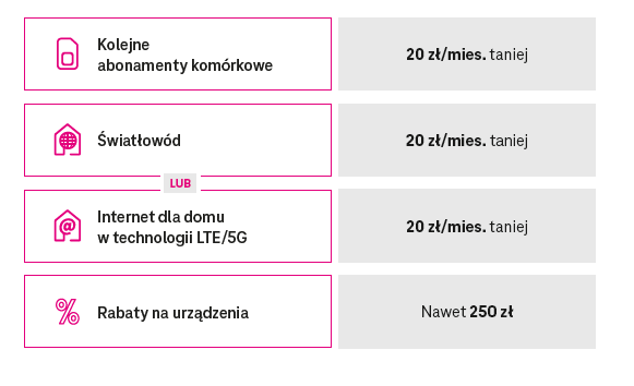 W T-Mobile lubimy dawać klientom wyjątkowe oferty, dlatego w ramach programu „Korzyści dla domu” mogą oni wybierać jeszcze więcej usług, zyskując tym samym jeszcze więcej zniżek. Jak to możliwe? Dla posiadaczy abonamentu na usługi głosowe, kolejne usługi dla domu będą tańsze o 20 zł miesięcznie od ceny wyjściowej. Klienci mogą więc zdecydować się na kolejny abonament, internet światłowodowy bądź internet dla domu w niższej cenie.