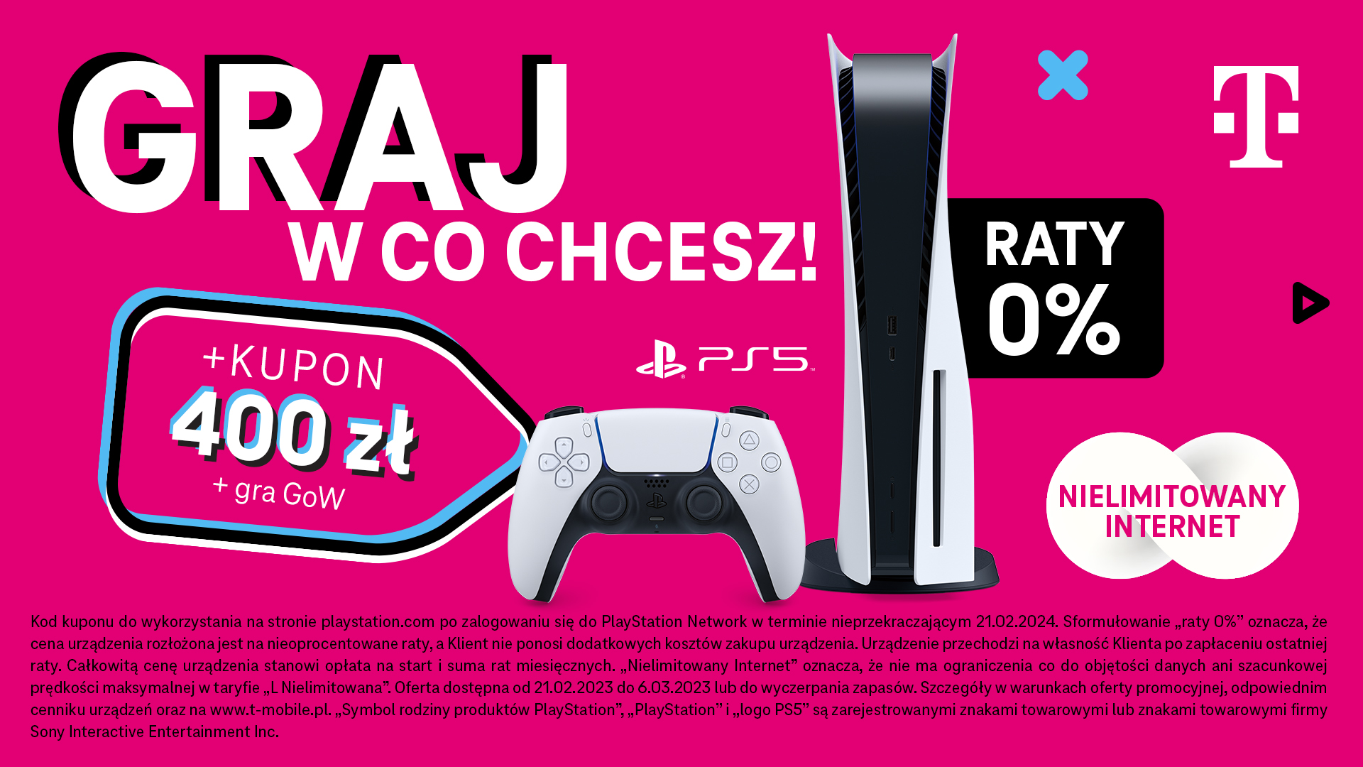 Nowe technologie to nie tylko praca oraz poważne tematy biznesowe. To także wielka dziedzina branży rozrywkowej, z której korzystają ludzie w każdym wieku. Dlatego klienci T-Mobile skorzystać mogą z oferty łączącej zakup konsoli PlayStation 5 wraz z jednym z największych hitów – God of War: Ragnarok oraz kodami o wartości aż 400 zł na zakup w sklepie PlayStation Store np. 12-miesięcznej subskrypcji PlayStation Plus Extra. Gry już dawno przestały być postrzegane jako rozrywka dla dzieci. Według najnowszych raportów Global Games Market Report, ponad 38% procent ludzi to gracze! Oznacza to, że także wielu klientów firm telekomunikacyjnych lubi spędzać czas na graniu, traktując taką aktywność na równi z innymi gałęziami rozrywki, jak filmy, seriale czy książki. W odpowiedzi na te potrzeby, w ofercie T-Mobile pojawia się najnowsza konsola Sony PlayStation 5 wraz z kontrolerem DualSense oraz wielokrotnie nagradzaną grą God of War: Ragnarok. Osoby, które zdecydują się na skorzystanie z propozycji operatora otrzymają dodatkowo kody o wartości 400 złotych, do wykorzystania w sklepie PlayStation Store, na przykład na zakup 12-miesięcznej subskrypcji PlayStation Plus Extra, dającej dostęp do ogromnej bazy ponad 400 gier!