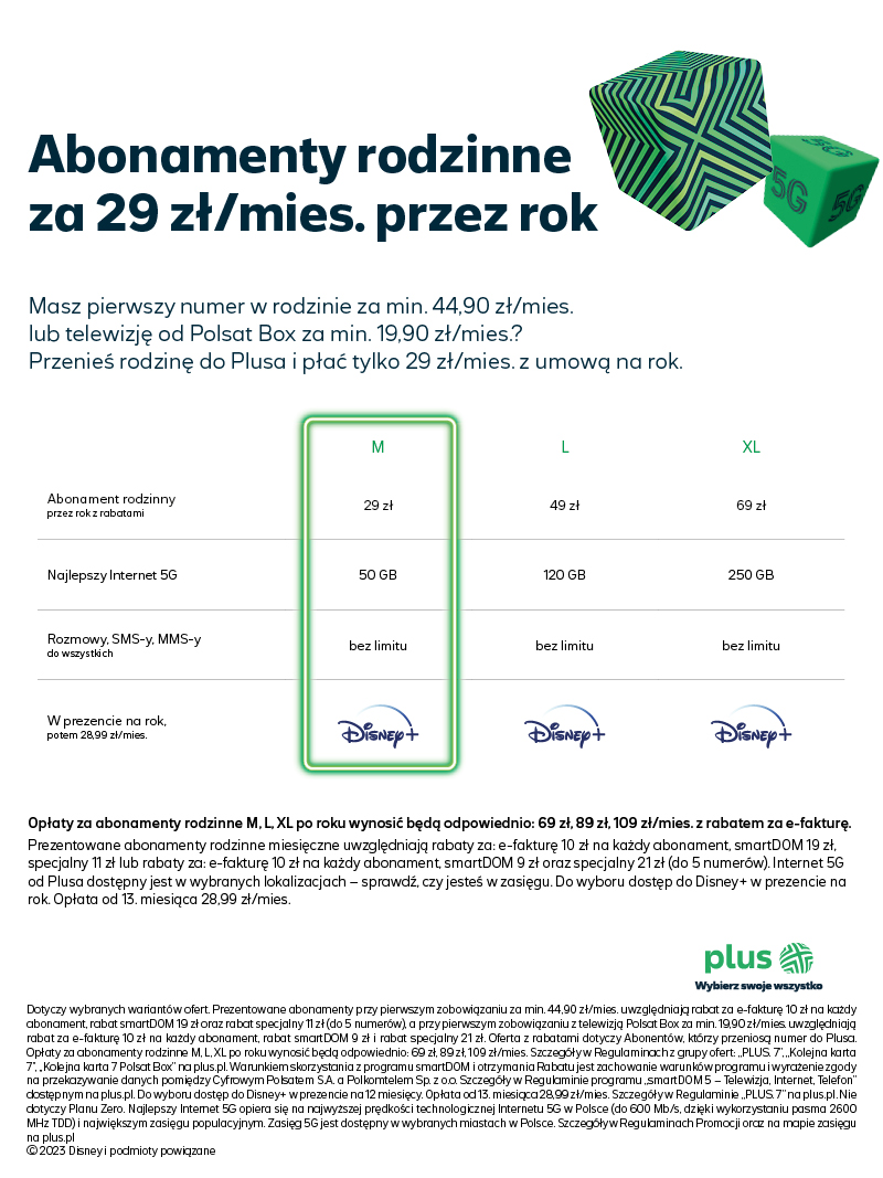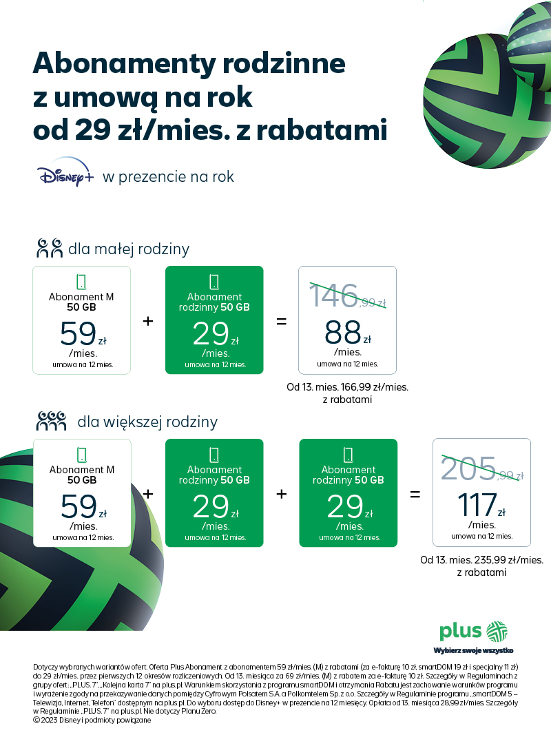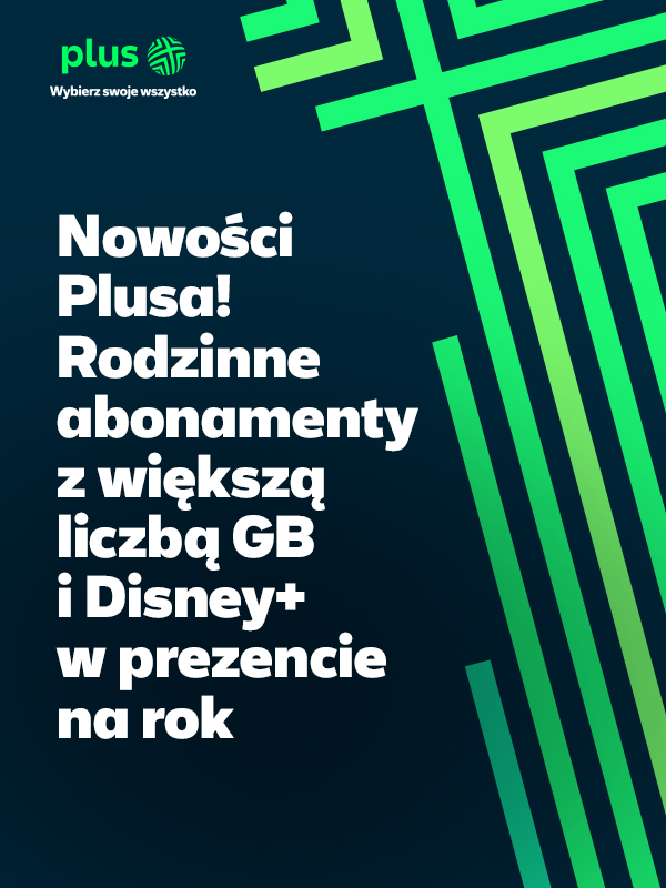 W Plusie najlepiej być całą rodziną. Specjalna oferta dla małych i dużych rodzin pozwala dobrać kolejne abonamenty już od 29 zł/mies. z umową na rok. W ramach abonamentów rodzinnych także można otrzymać dostęp do Disney+ w prezencie na cały rok.