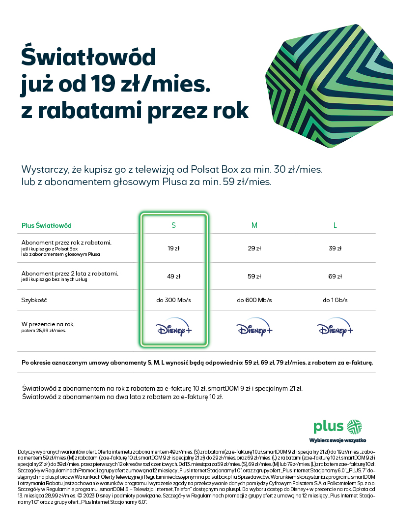 Również w przypadku oferty internetowej użytkownicy mogą otrzymać dostęp do Disney+ na rok w prezencie. Klienci przenoszący internet do Plusa są zwolnieni z opłat przez pierwsze trzy miesiące.