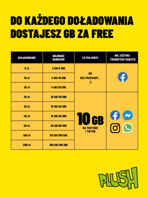Wybierając pakiet za 40 złotych na 30 dni w Plushu można zyskać łącznie nawet 2000 dodatkowych gigabajtów do wykorzystania nie przez rok, ale przez lata. Po aktywacji promocji – po wpisaniu kodu *136*11*2000#, a następnie kliknięciu zielonej słuchawki, fani Plusha będą otrzymywać co miesiąc paczki ze 150 GB danych. Korzystając z pakietu 12 razy bez przerwy co 30 dni, po roku można zgarnąć dodatkowo jednorazowy pakiet 200 GB. W sumie Plush daje nawet 2000 GB, z których można korzystać zimą i latem. Miśki decydujące się na tańszy pakiet za 35 zł lub 30 zł mogą zgarnąć nawet 1500 GB do wykorzystania przez lata. Po wpisaniu kodu, *136*11*1500# i wciśnięciu zielonej słuchawki, użytkownicy Plusha będą dostawać aż 100 GB przez 12 miesięcy. Po zachowaniu ciągłości doładowań można zyskać bonus 300 GB. W Plushu nie musisz martwić się o chomikowanie neta.