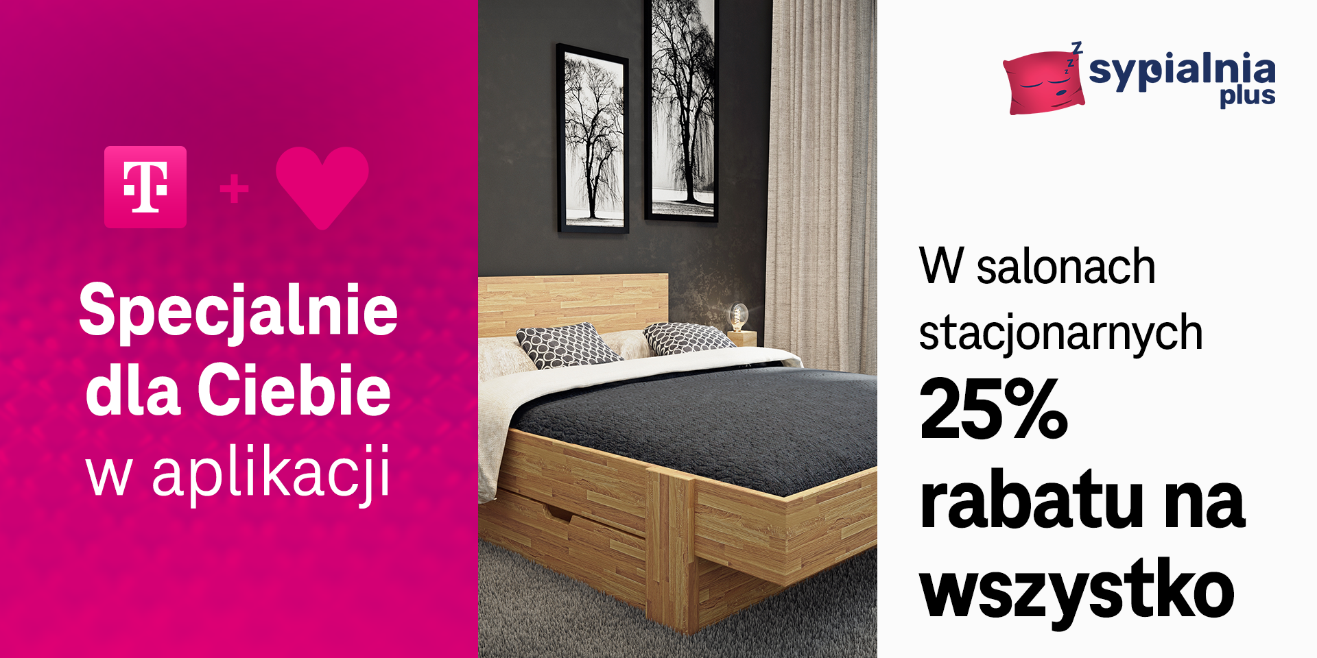 Kiedy nocny sen umożliwia pełną regenerację, każdy dzień może być jak święto. Wystarczy tylko dobrać odpowiedni materac, łóżko, kołdrę oraz poduszki, by stworzyć przestrzeń prawdziwego, efektywnego wypoczynku. Dla osób, które czują, że w swojej sypialni chciałyby coś zmienić, przygotowaliśmy więc 25% rabatu do wykorzystania w sklepach SypialniaPlus. Rabat dostępny w aplikacji „Mój T‑Mobile”, w sekcji „Benefity” należy okazać sprzedawcy przy zakupie. Można z niego skorzystać do 22 marca. Lista sklepów SypialniaPlus dostępna jest tutaj: