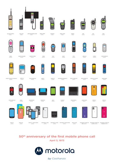 Przeprowadzona z adresu przy nowojorskiej Szóstej Alei rozmowa stała się punktem zwrotnym w historii ludzkości – użytkownicy nie musieli już czekać na połączenie siedząc przed aparatem telefonicznym ani wyczekiwać na wiadomość na pagerze. Dzięki komórce mogli zadzwonić w dowolnej chwili, z praktycznie dowolnego miejsca. – Kiedy nawiązywałem pierwsze publiczne połączenie komórkowe 3 kwietnia 1973 roku, wiedziałem, że to dopiero początek, a Motorola i cała branża mobilna wywołali właśnie rewolucję w komunikacji – powiedział Martin Cooper. – Od tamtego czasu pojawiło się mnóstwo przełomowych innowacji, wiele z nich opracowała zresztą Motorola. Pierwsze półwiecze to dopiero rozgrzewka. Przed nami kolejne fascynujące odkrycia, które mają szansę zmienić ludzkość. 50 lat później Motorola może z dumą powiedzieć, że wciąż pozostaje liderem, jeśli chodzi fundamentalne technologie, patenty oraz innowacje, które kształtują otaczający nas świat. Od chwili udostępnienia ważącego prawie 2 kg i mającego ponad 30 cm długości modelu DynaTAC 8000X marka przebyła naprawdę długą drogę. W pierwszej dekadzie XXI wieku, gdy na rynku dominowały komórki o dość przewidywalnym wzornictwie, Motorola wprowadziła kolejny wyjątkowy telefon – RAZR V3. Dzięki swojej niezwykle smukłej konstrukcji z klapką, do dziś pozostaje on urządzeniem kultowym.