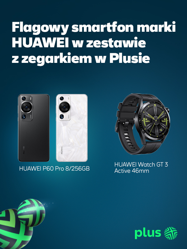 Flagowy smartfon marki HUAWEI w zestawie z zegarkiem w Plusie. Plus wprowadza do swojej oferty nowy smartfon HUAWEI P60 Pro 8/256GB. Klienci, którzy zdecydują się na zakup urządzenia w sklepie internetowym Plusa będą mogli dobrać HUAWEI Watch GT 3 Active 46mm jedynie za złotówkę.