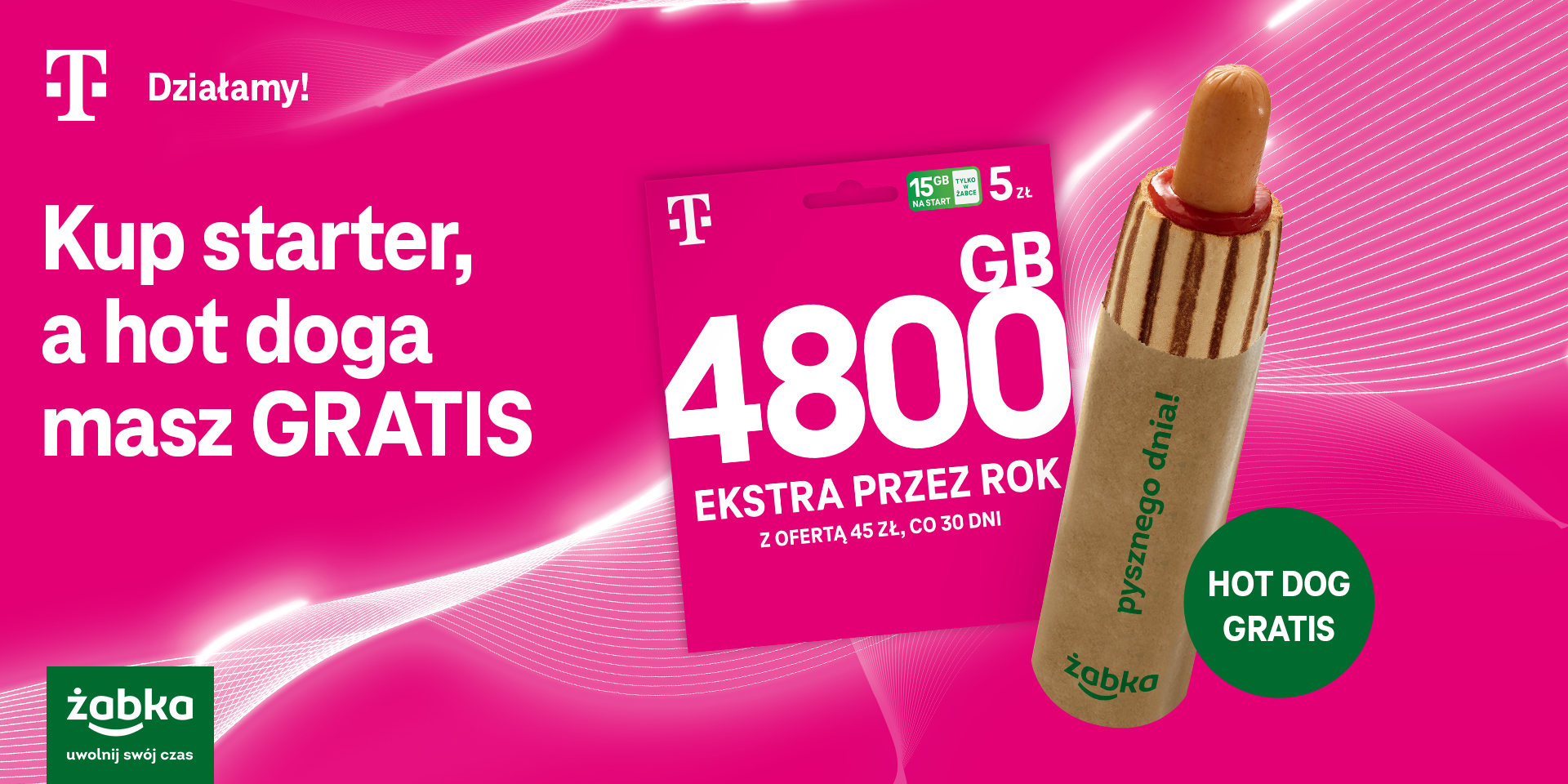 Odpowiednie przygotowanie do podróży to podstawa – poza dobrze spakowanym plecakiem i wygodnymi butami warto zadbać o solidny pakiet internetu mobilnego w telefonie i szybką przekąskę na drogę. W T‑Mobile działamy tak, że we współpracy z siecią Żabka zaspokajamy głód gigabajtów i zapewniamy coś smacznego. Teraz klienci, kupując w sklepach Żabka starter T‑Mobile na kartę z 4800 GB ekstra przez rok (12 x 400 GB) z ofertą 45 zł na 30 dni, w prezencie otrzymają bon wydrukowany na paragonie, który uprawnia do odbioru dowolnego hot-doga z oferty sieci. Aby skorzystać z akcji promocyjnej, należy kupić starter do 13 czerwca 2023 r. Hot-doga można odebrać później – bon jest ważny bowiem do 20 czerwca 2023 r. A jak zgarnąć tak ogromną porcję internetu?